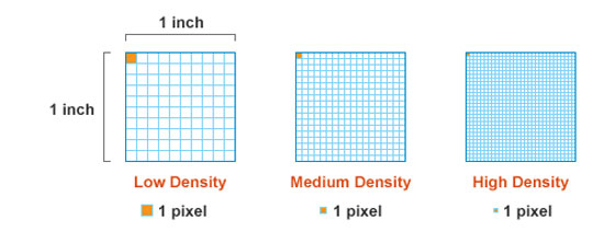 3- مساحة الشاشة و دقتها حيث أنه هناك علاقة بينهما كلما قل حجم الشاشة و زادت الدقة كلما زادت كثافة البكسلات في الإنش الواحد و على سبيل المثال: