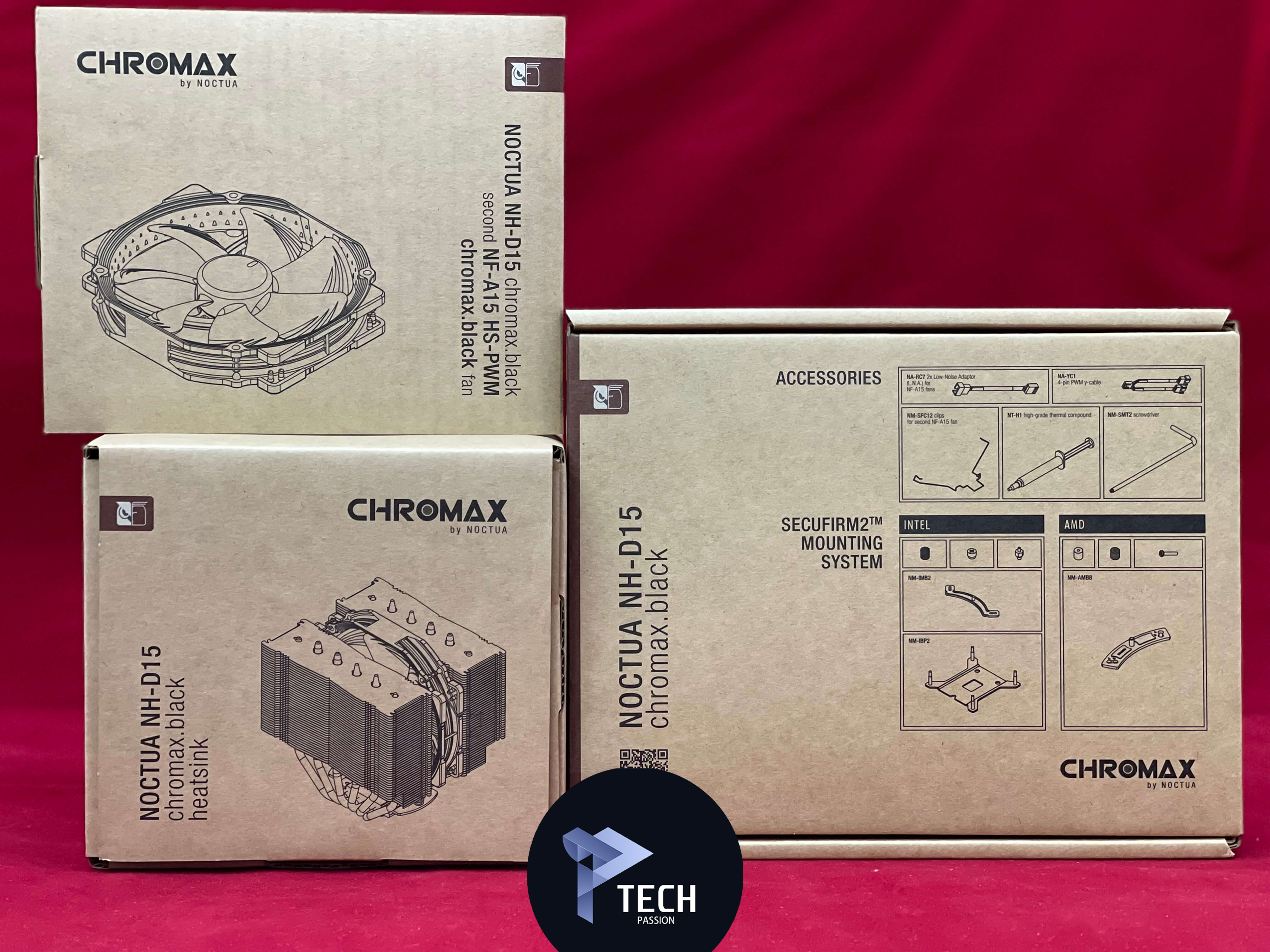 كلا من مبردين Noctua NH-D15 وD15s Chromax يأتيا بنفس الملحقات تقريبا باختلاف اسم المبرد مع اختلاف في مبرد D15 حيث أنه يحتوي على مروحة إضافية من نوع NF-A15 HS التي تأتي بسرعة 1500 لفة في الدقيقة.