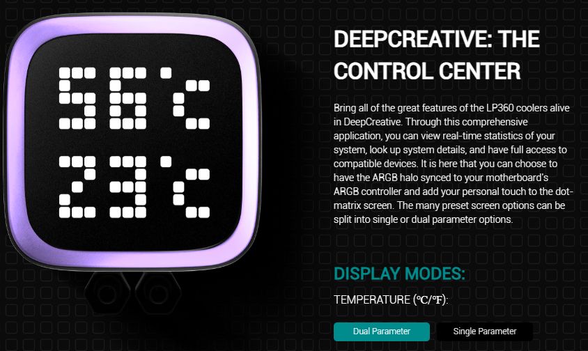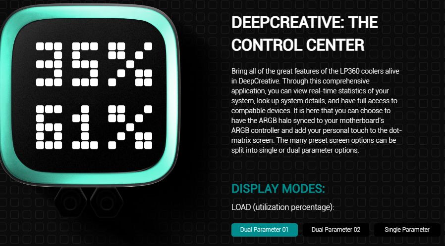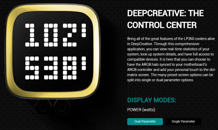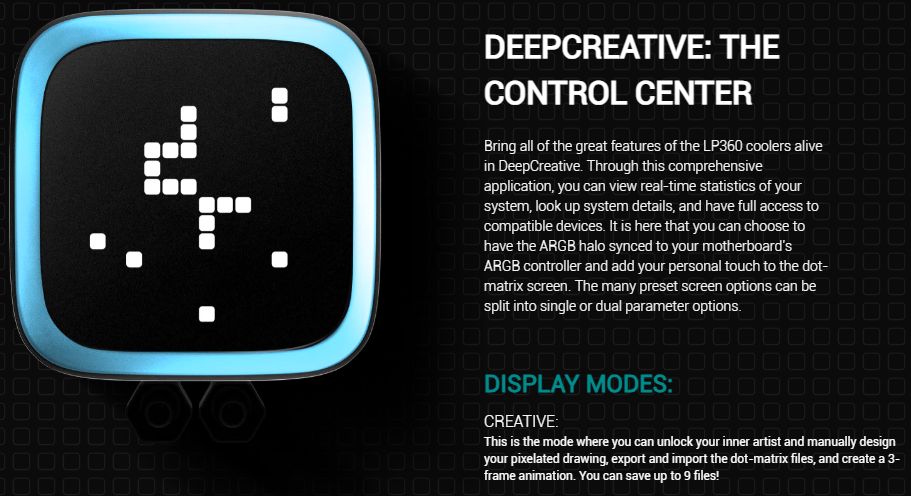 مبرد DeepCool LP360 من أحدث مبردات الجيل الحالي تميز المبرد بـ المضخة التي تأتي من الجيل الخامس، لدى المبرد شكل جمالي أفضل من الكثير من المبردات المائية الحالية، تميز المبرد أيضا بتواجد شاشة بشكل مختلف التي تظهر المعلومات على هيئة Pixels والتي لها العديد من المميزات كما ذكرنا.