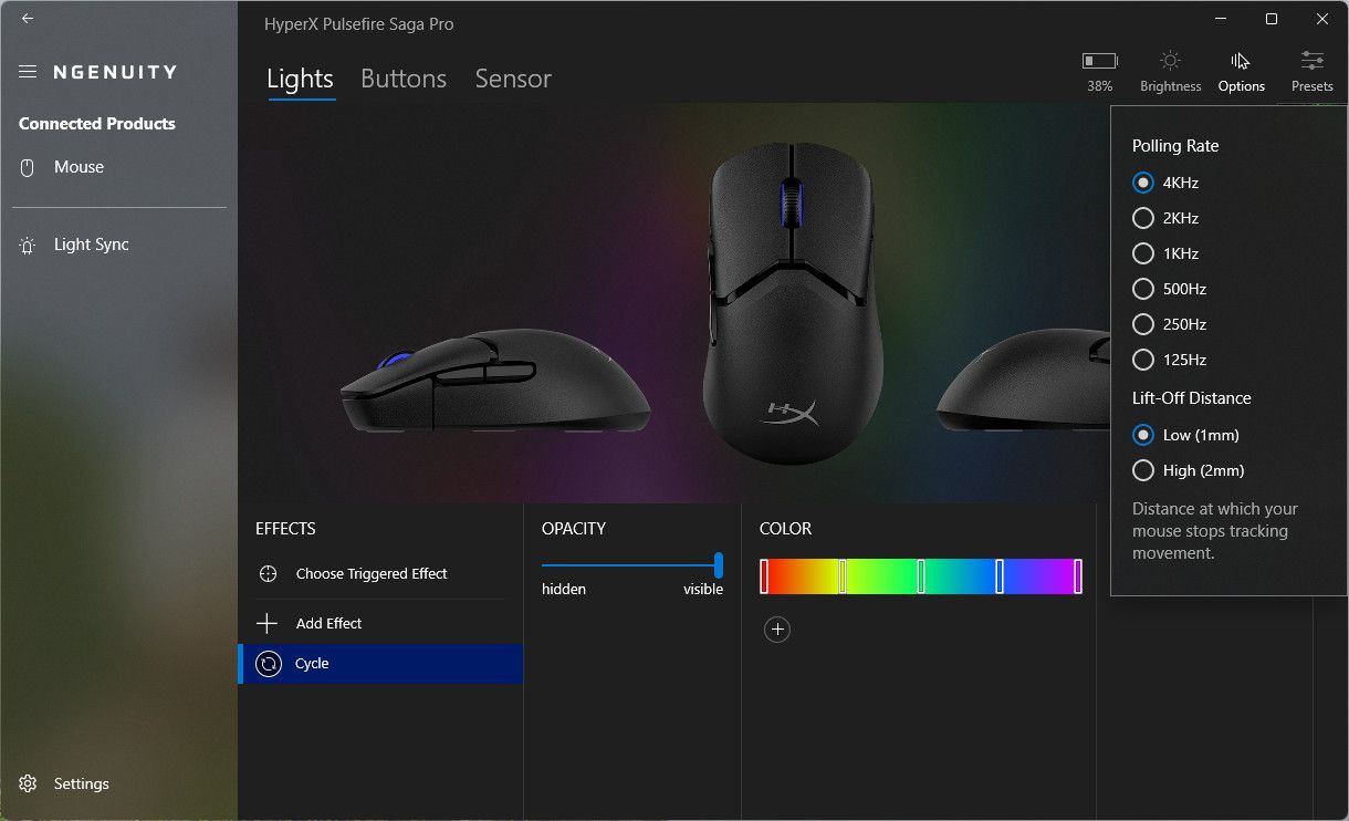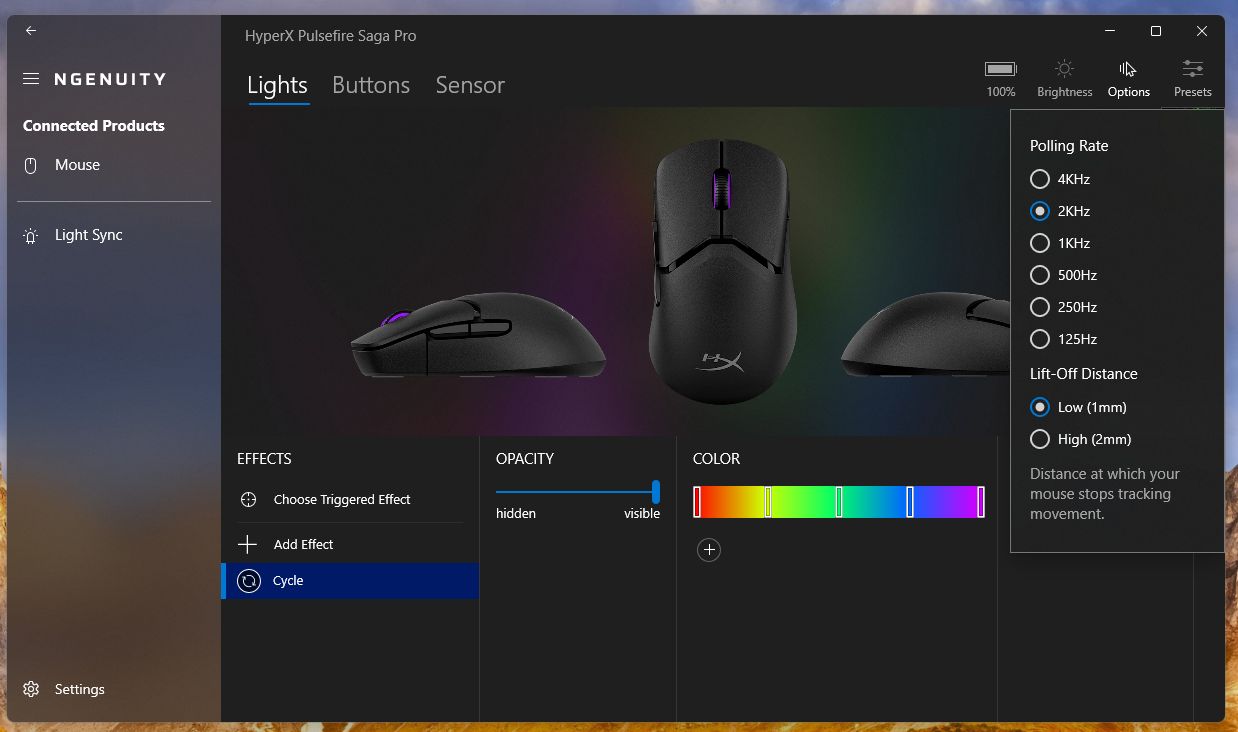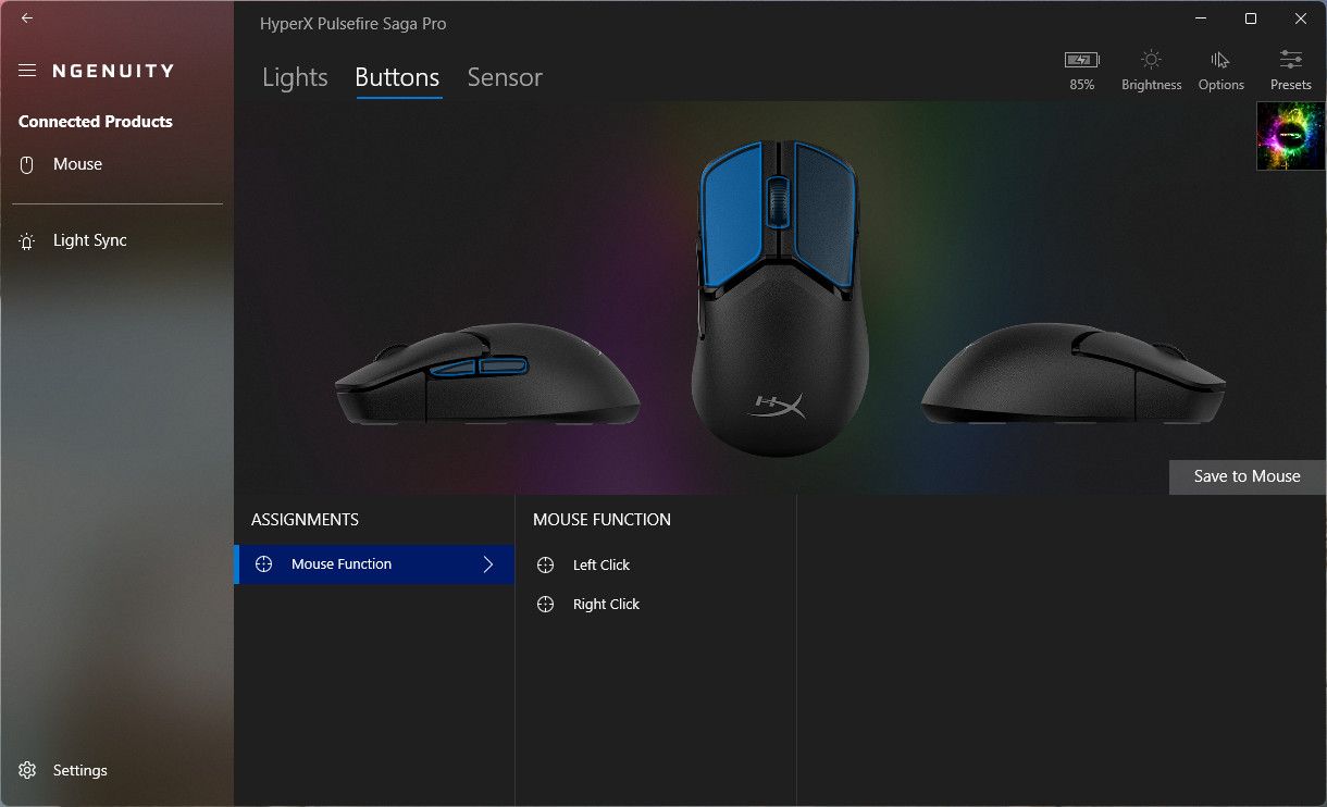 ويساعد برنامج HyperX Ngenuity في التحكم في مميزات الماوس كاملة سواء من تغيير عمل آي كليك و التحكم في Polling Rate وأيضا التحكم في الألوان.
