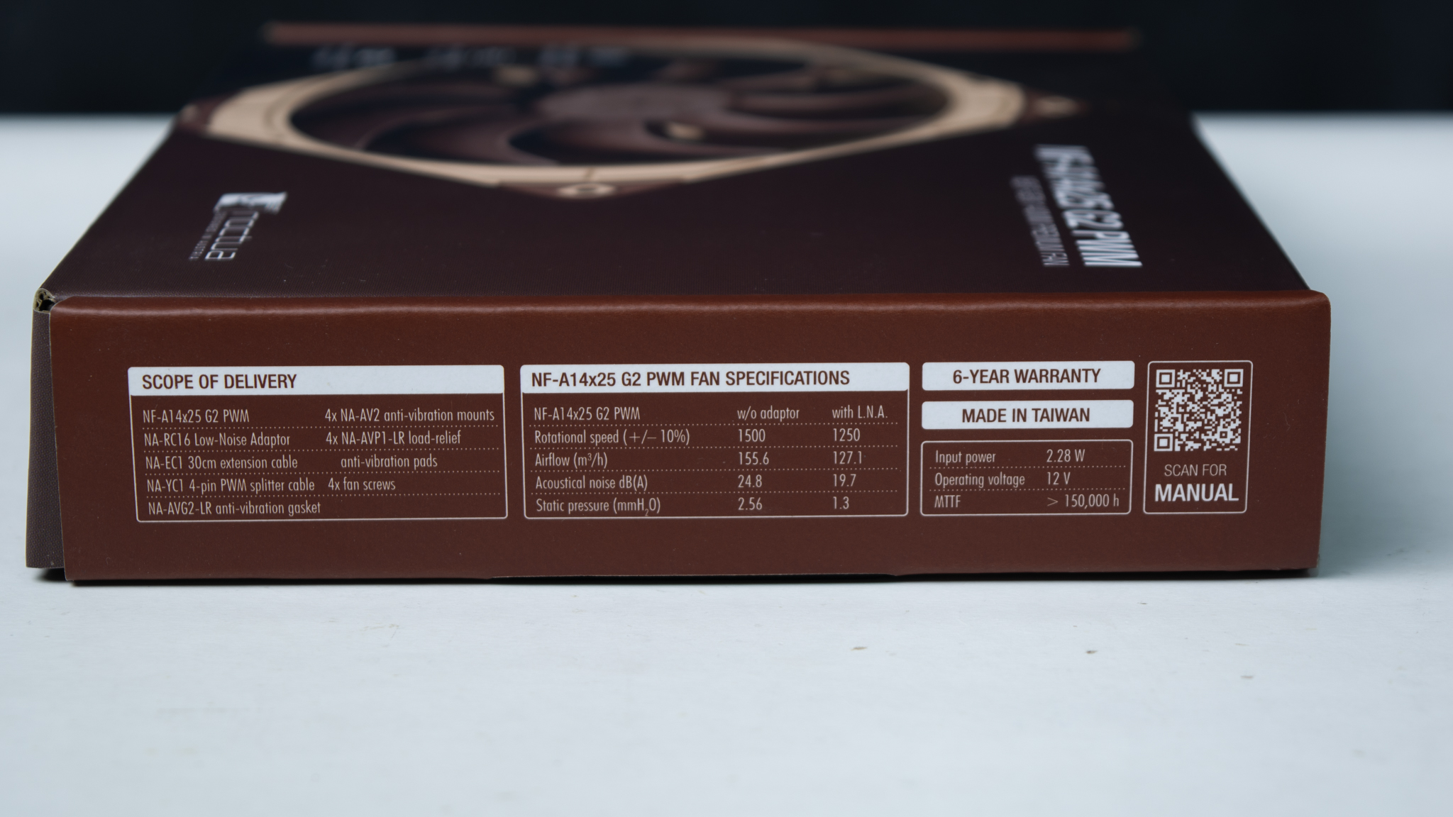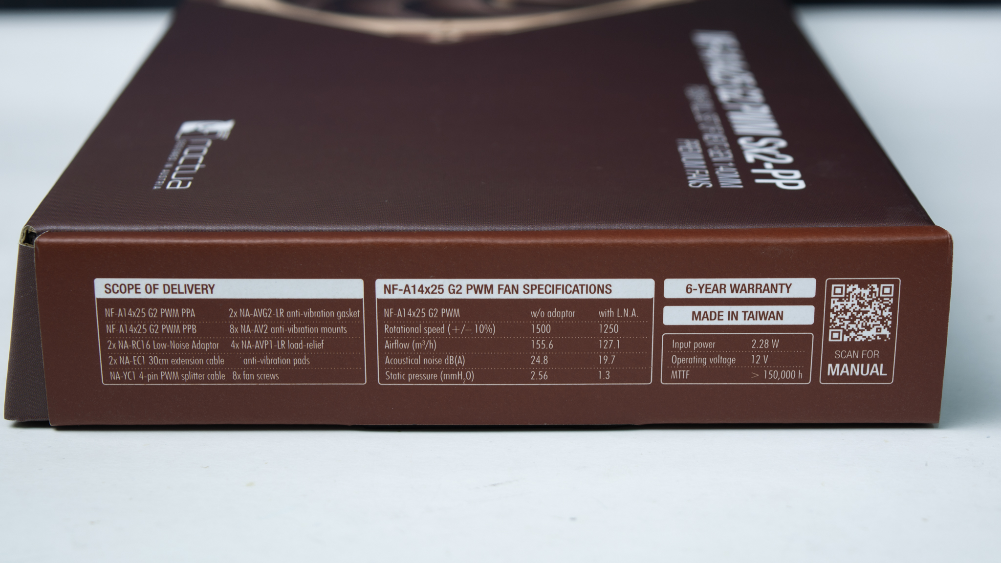 المراوح المستخدمة في المراجعة هي NF-A14x25 G2 و NF-A14x25 G2 Sx2-PP والفرق بينهم فقط أن مراوح Sx2-PP عبارة عن مراوح تكميلية مع نفس الخصائص من حيث عدد اللفات و قدرة تدفق الهواء وضغط الهواء (ستجد اسم المراوح في أعلى الصندوق).