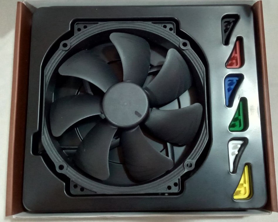 داخل العلبة ستجد المروحة و48 موانع اهتزازات من نوع NA-AVP3 تنقسم لست ألوان (الأبيض – الأسود – الأحمر – الأخضر -الأصفر – الأزرق) مع 4 مسامير للربط