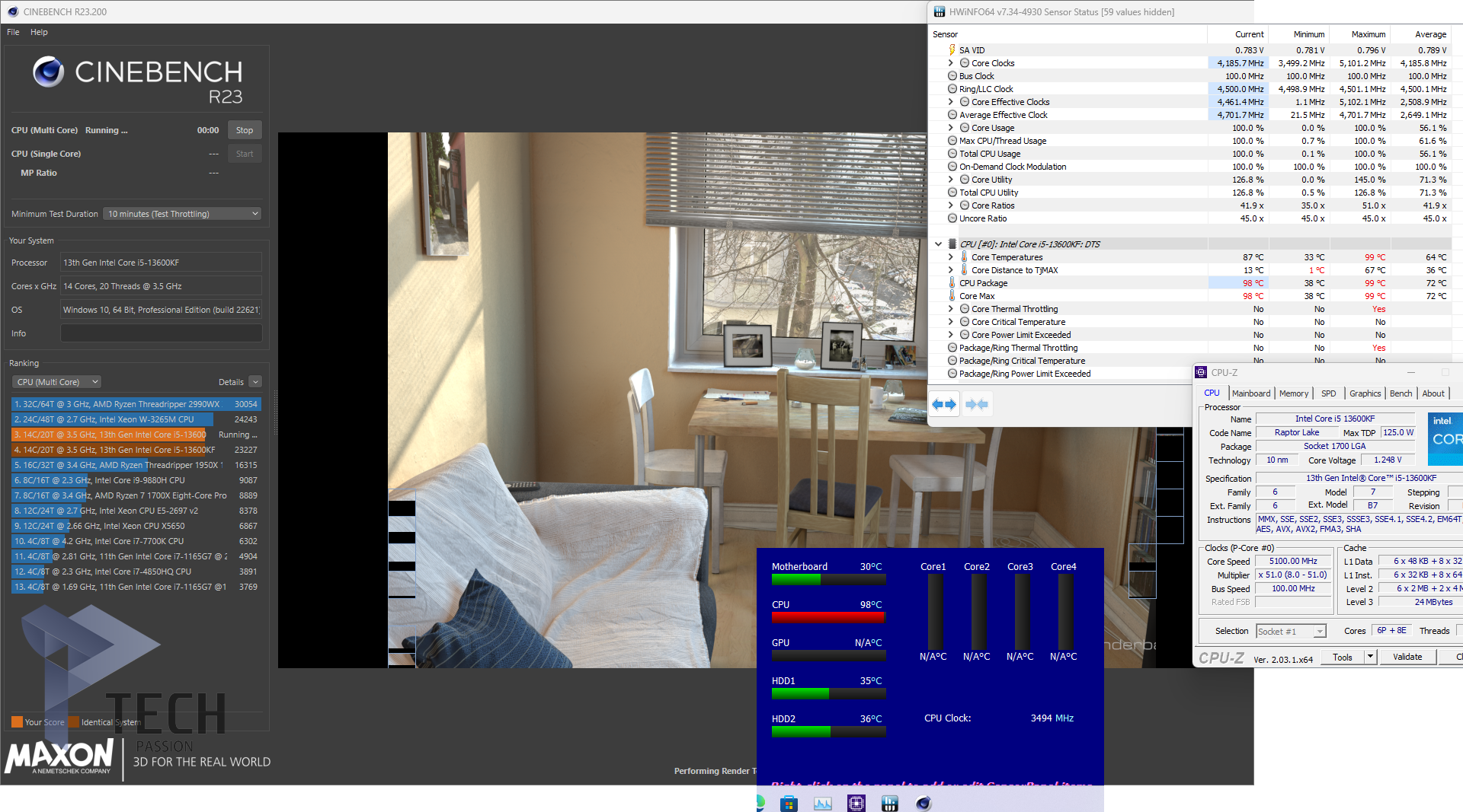 • اختبار CINEBENCH R23 على تعدد الأنوية لهذا المعالج وصلت درجة الحرارة إلى 99 درجة، وحقق نتيجة 23265 نقطة.