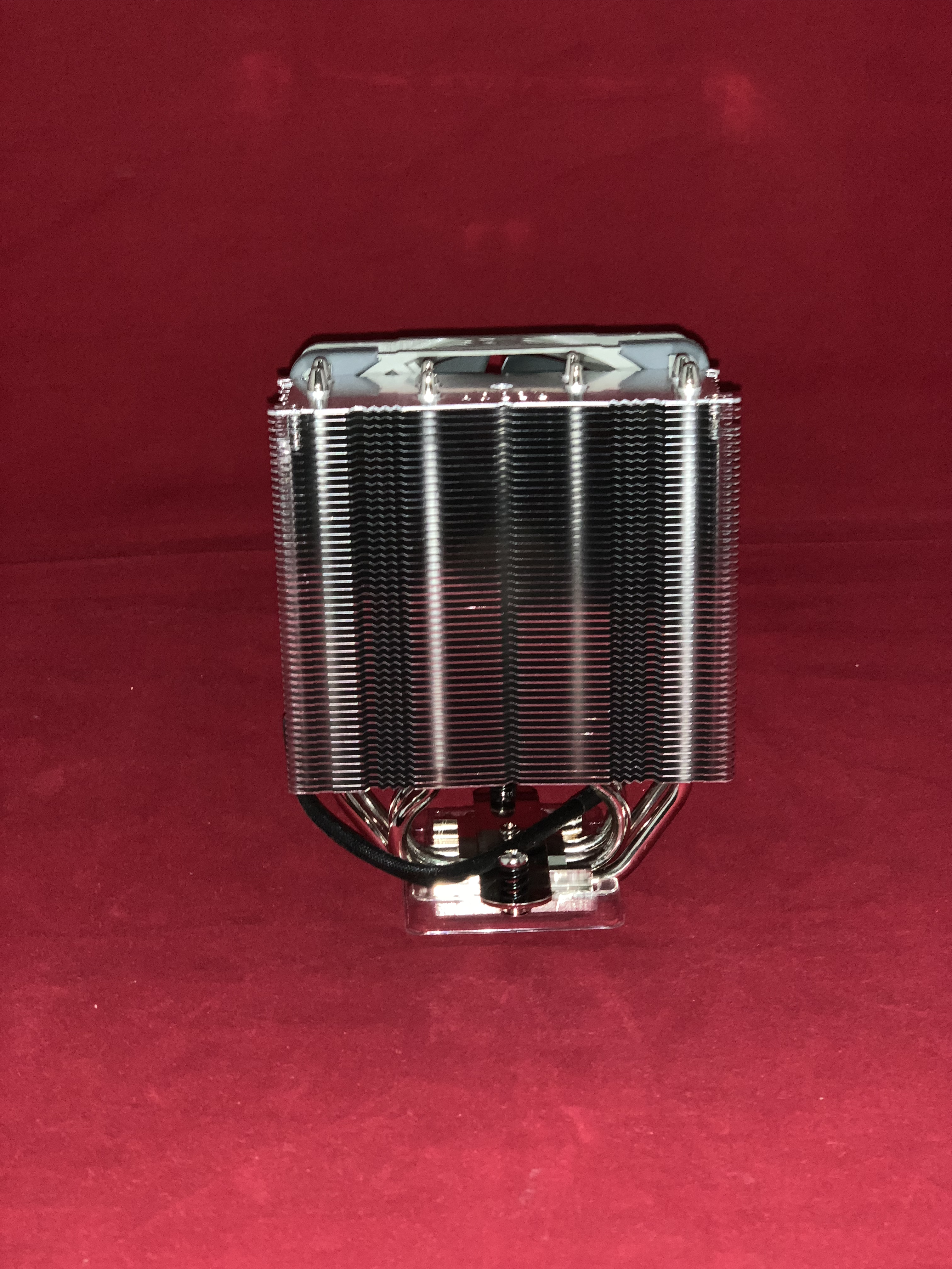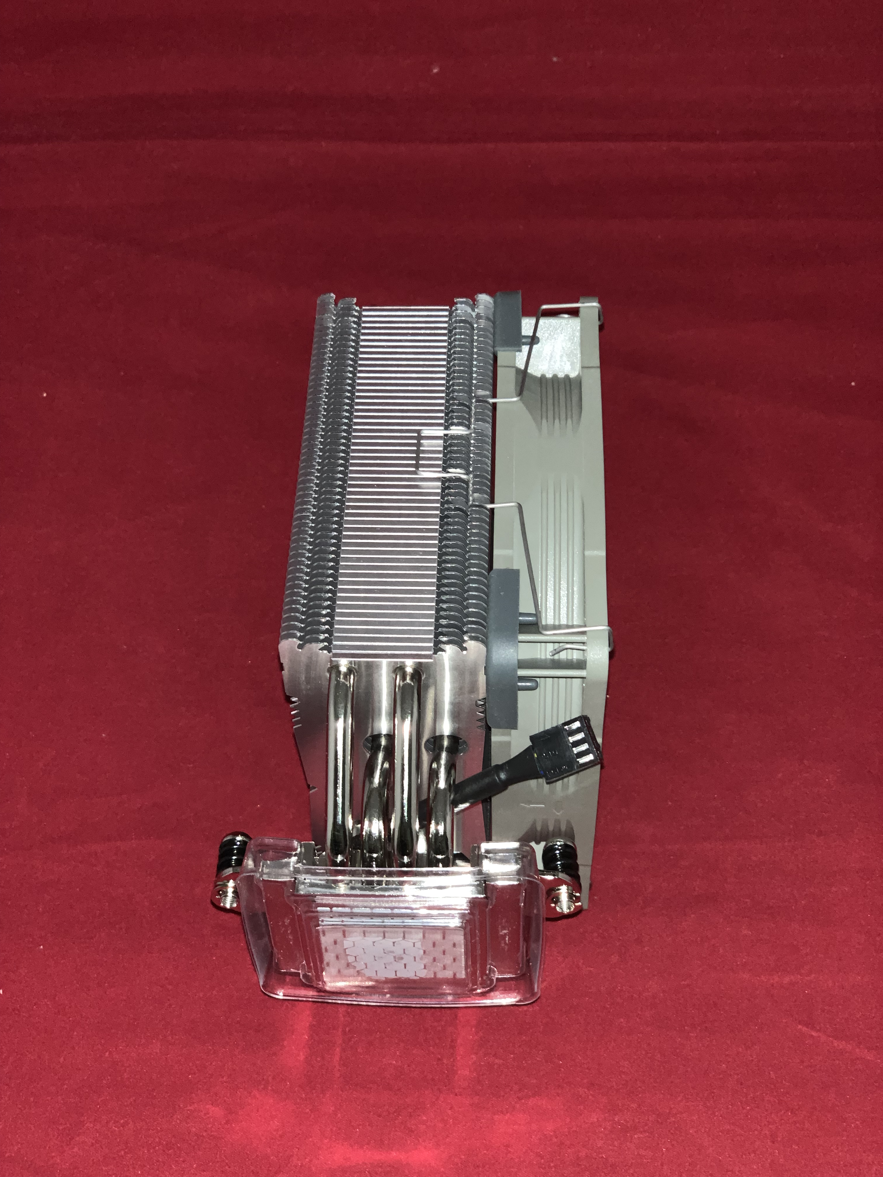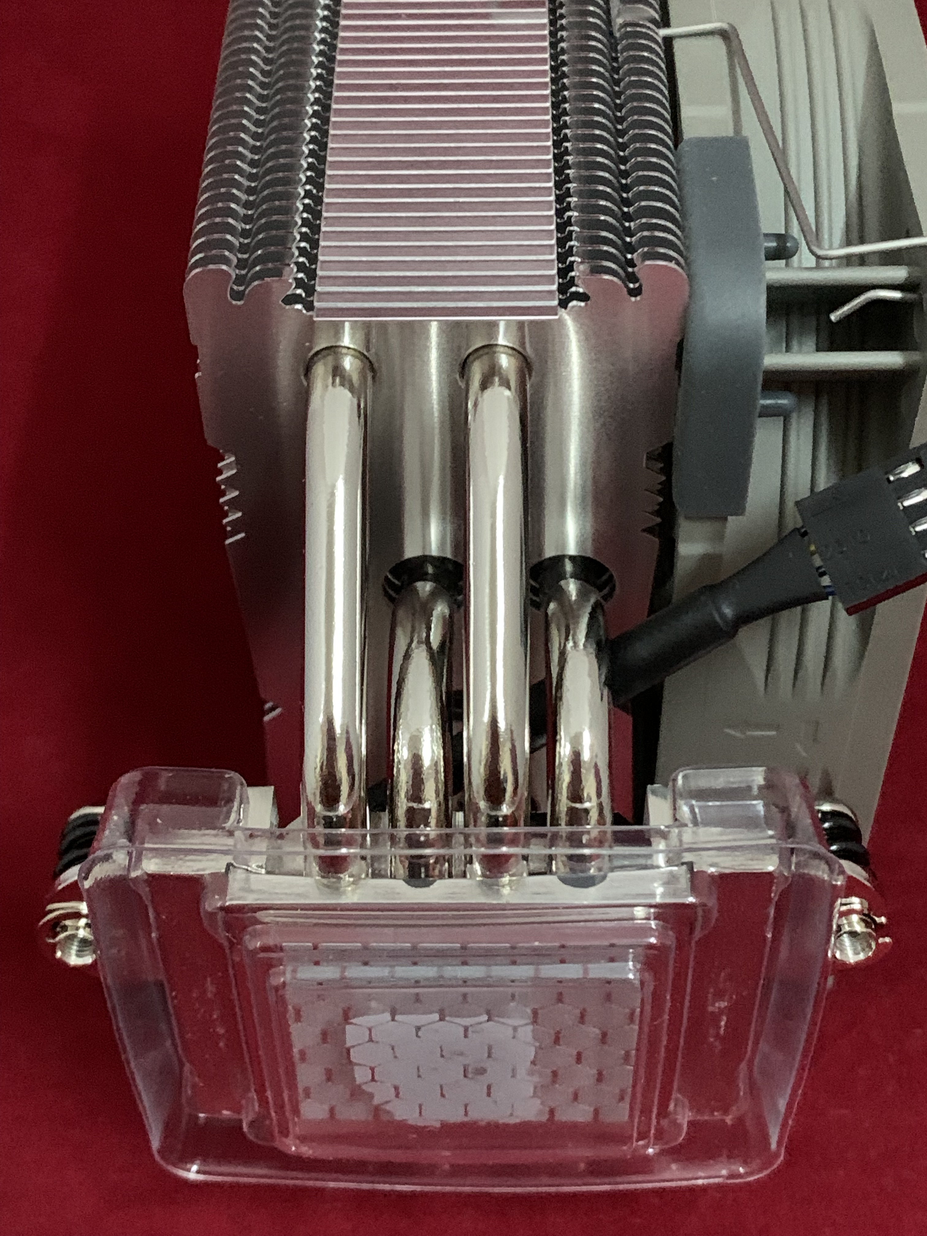 • توضح صورة مراجعة المبرد الهوائي Noctua NH-U12s Redux انه يتكون من أربع أنابيب نحاسية التي تكون مطلية بالنيكل، والتي ترتبط بالبرج لو تم تقسيم البرج إلى جزئين بالتساوي ستلاحظ أن الأربع أنابيب في كل جزء منهم، والأربع انابيب مرتبطة بقاعدة لامعة، وتلك القاعدة عليها المعجون الحراري الخاص بالشركة.