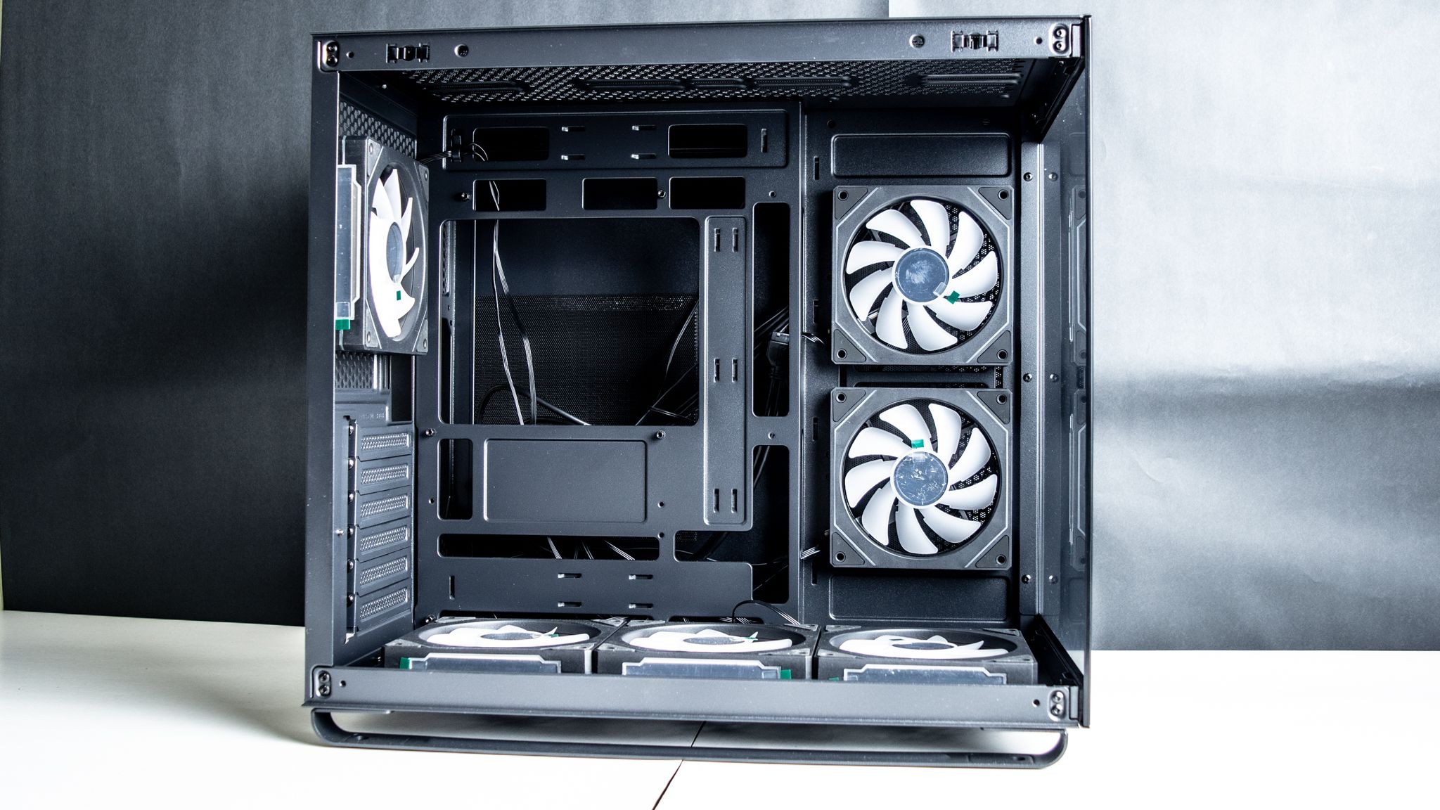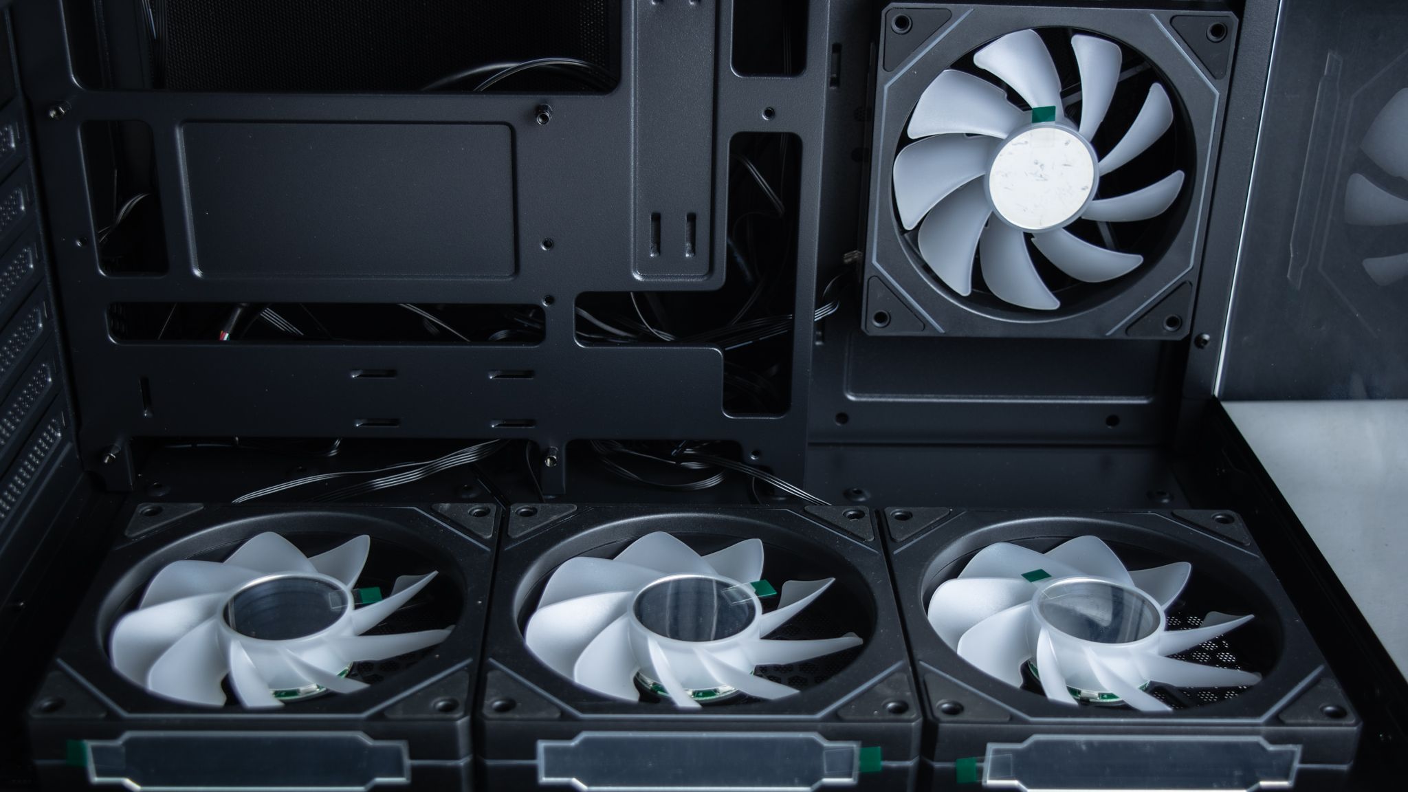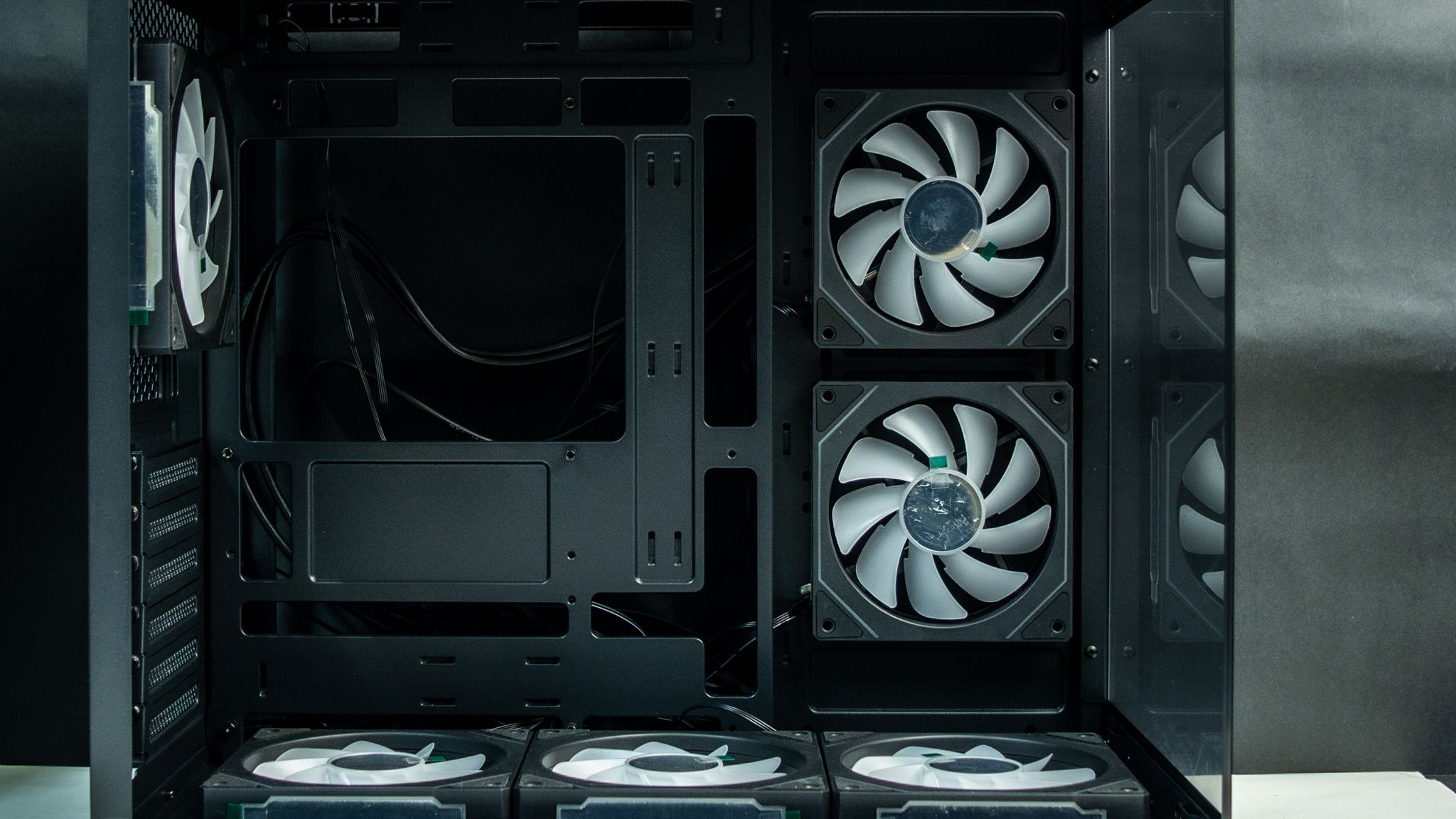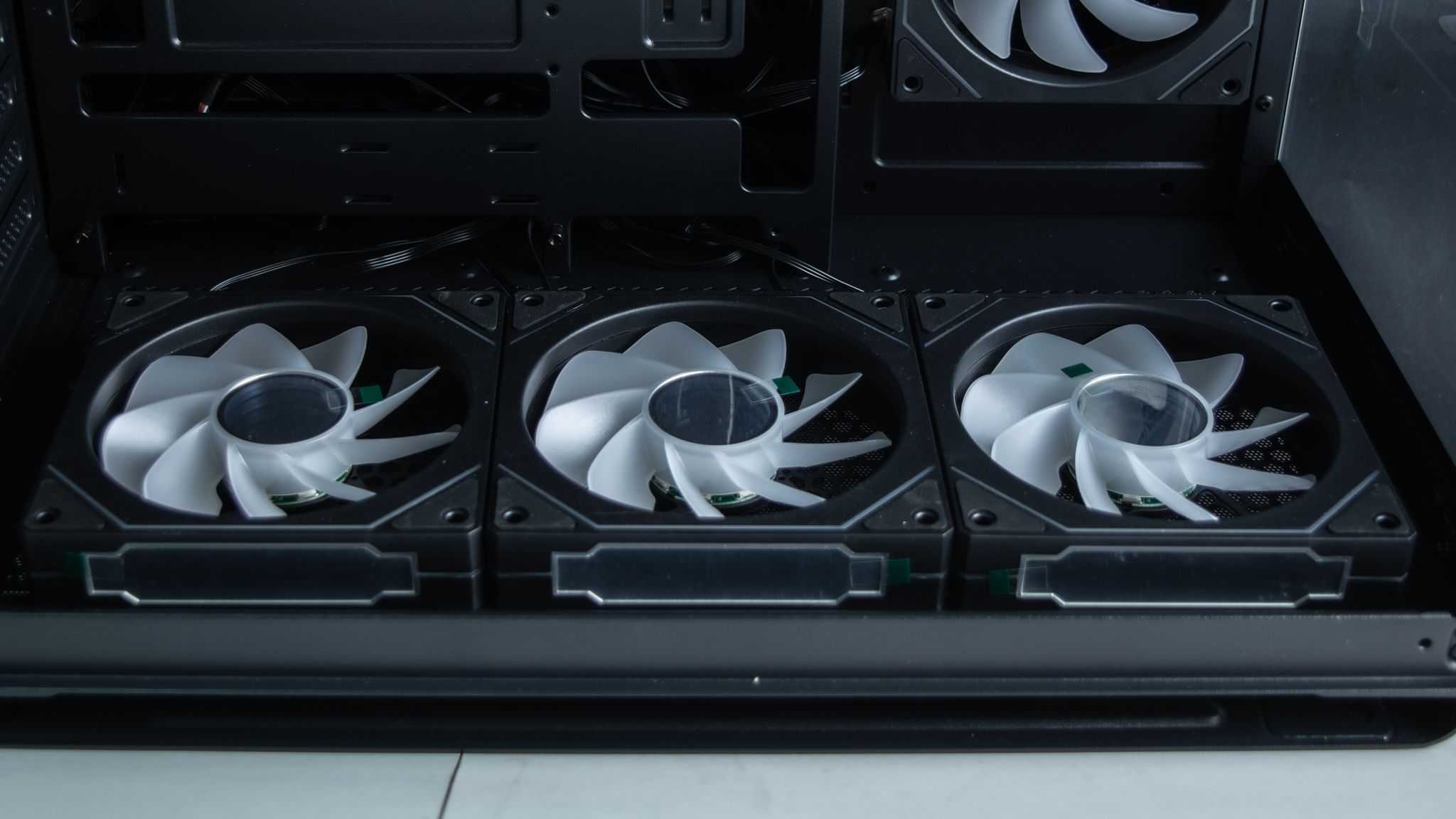 بجانب تواجد ثلاث مراوح في أسفل الصندوق والتي تأتي بزعانف عكسية حتى لاتفقد المظهر الجمالي أي أنها مسئولة عن ادخال الهواء، ومن المفترض أن يكون ماتور المراوح أمام المستخدم لكن في تلك الحالة سوف تفقد المراوح الشكل الجمالي الخاص بها مع إمكانية تركيب ريداتير حتى 360 ملم، ولا أنصح بذلك، لأن تركيب الريداتير من الأسفل لن يكون التبريد بكامل كفائتة بـ الإضافة إلى الجاذبية أيضا وطريقة التركيب.