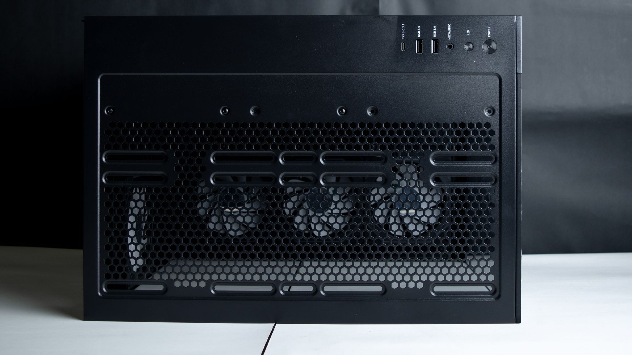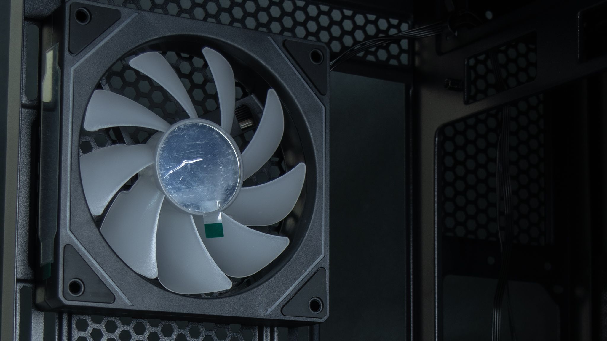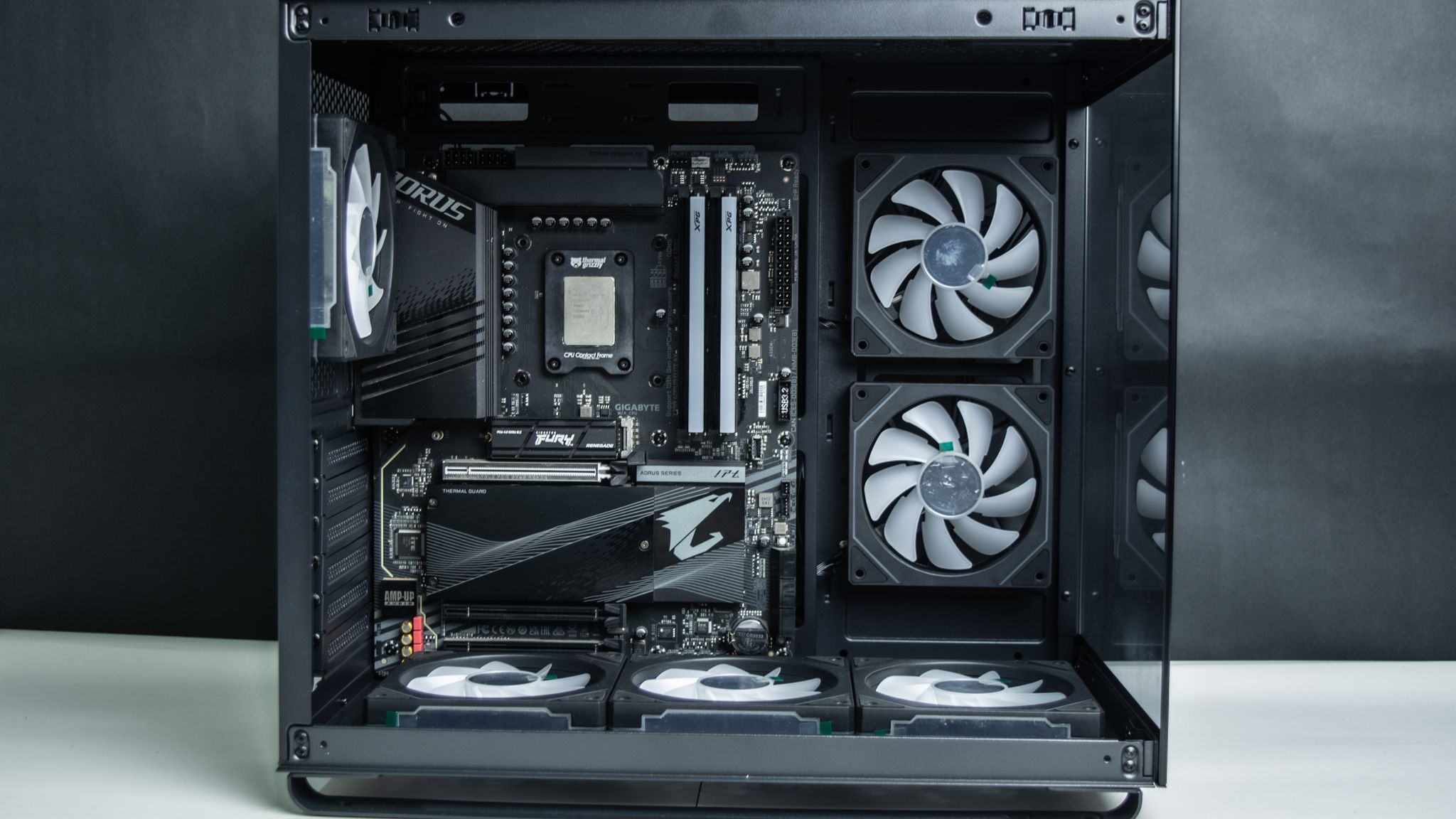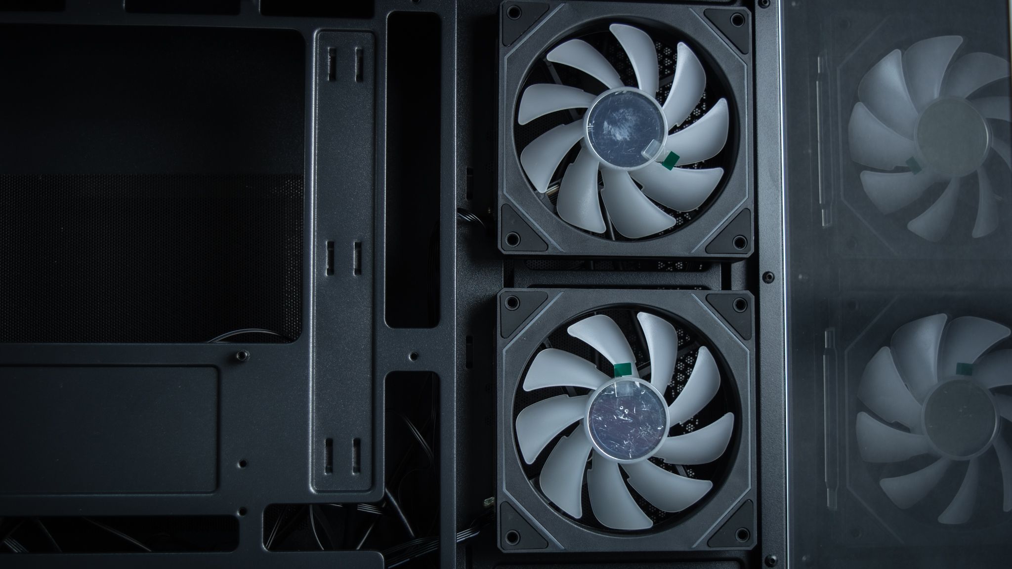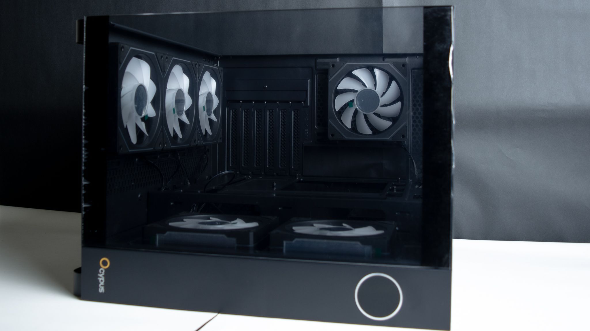 بجانب تواجد ثلاث مراوح في أسفل الصندوق والتي تأتي بزعانف عكسية حتى لاتفقد المظهر الجمالي أي أنها مسئولة عن ادخال الهواء، ومن المفترض أن يكون ماتور المراوح أمام المستخدم لكن في تلك الحالة سوف تفقد المراوح الشكل الجمالي الخاص بها مع إمكانية تركيب ريداتير حتى 360 ملم، ولا أنصح بذلك، لأن تركيب الريداتير من الأسفل لن يكون التبريد بكامل كفائتة بـ الإضافة إلى الجاذبية أيضا وطريقة التركيب.