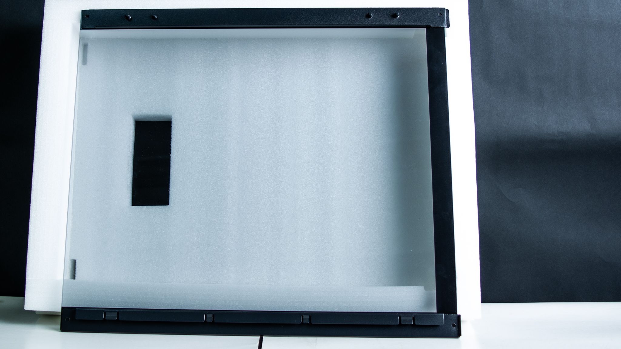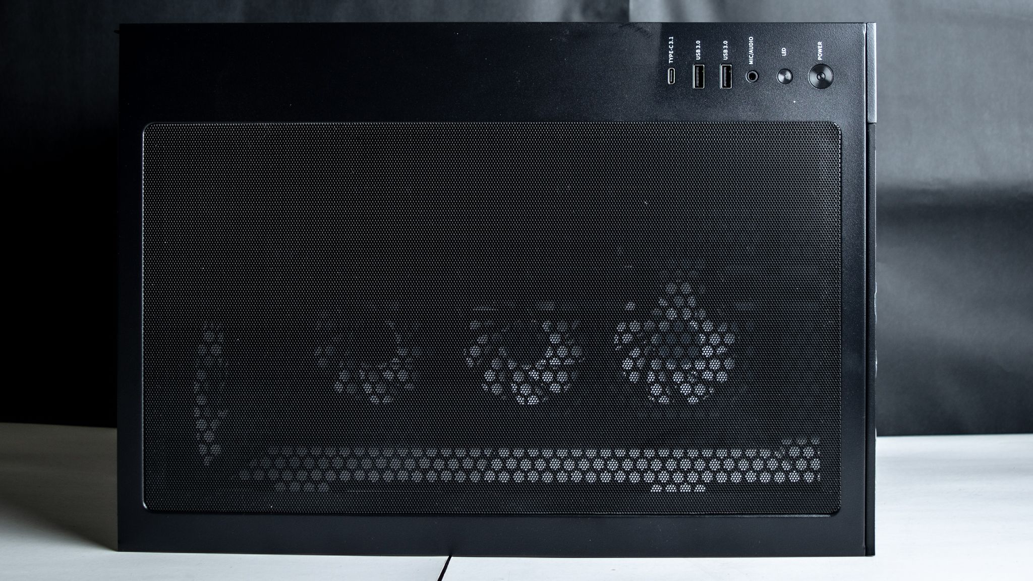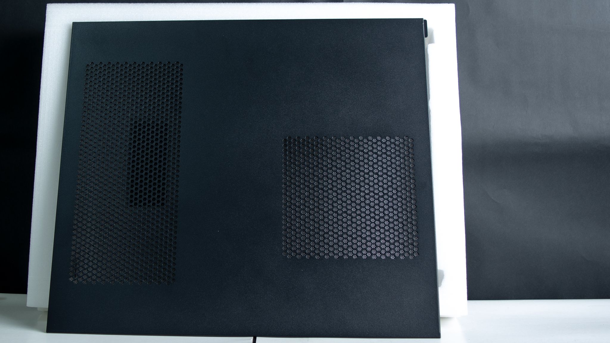 والجانب الأيسر يحتوي على شكل شاشة التي تعرض درجة حرارة المعالج أو كارت الشاشة مع اللوحة العلوية لـ صندوق الحاسوب والفلتر العلوي.