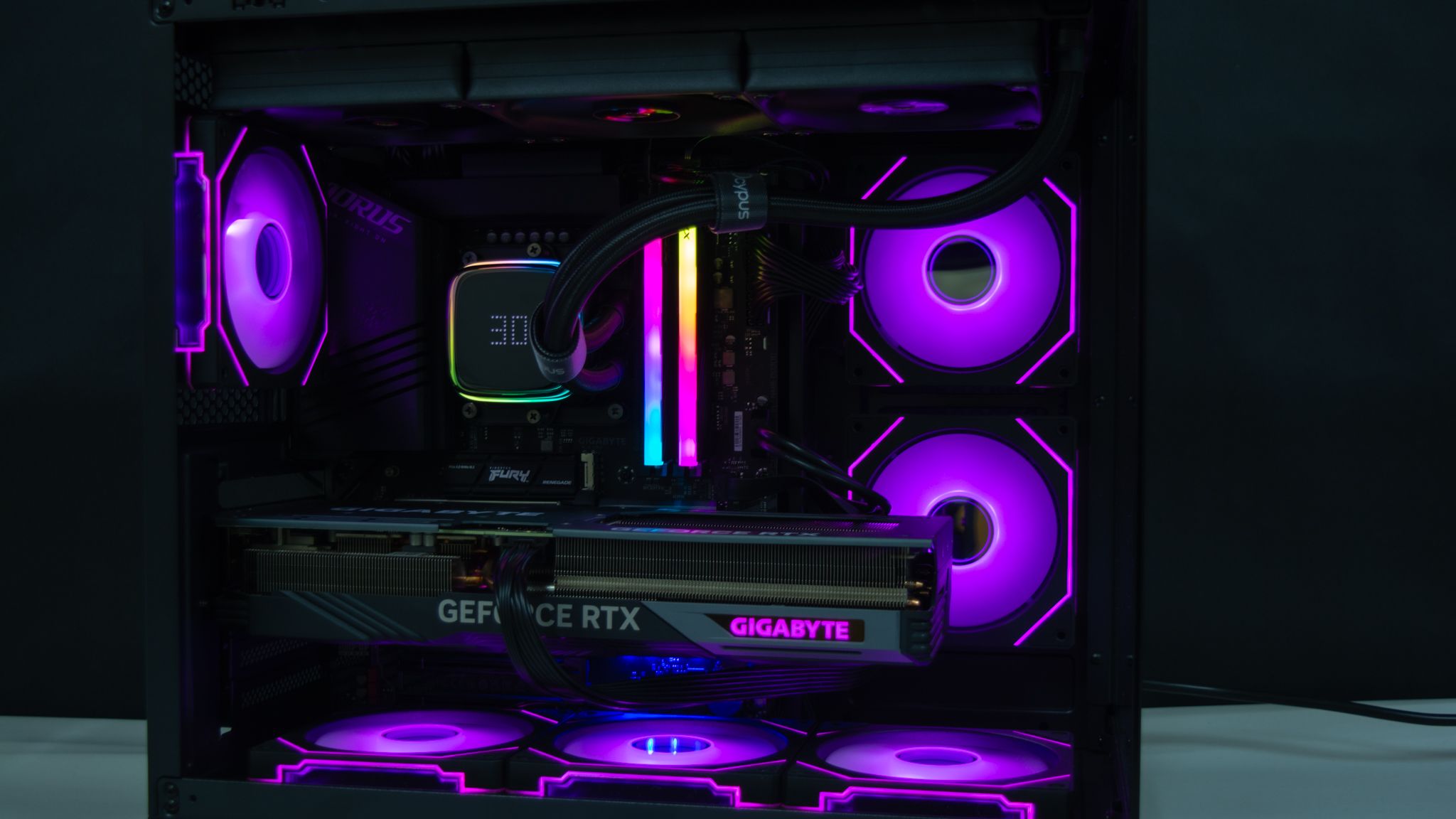 تأتي اللوحة الأم من حجم ATX وهذا أقصى حجم يستطيع الصندوق تحمله، بينما يأتي كارت الشاشة RTX 4070Ti والذي يأتي بطول أقل من طول الصندوق مما لا يسبب أي عائق أثناء عملية التركيب مع استخدام مبرد Ocypus Iota L36 هو مبرد عالي الجودة كما تم المراجعة عليه من قبل وسيشارك معنا في تجربة اليوم.