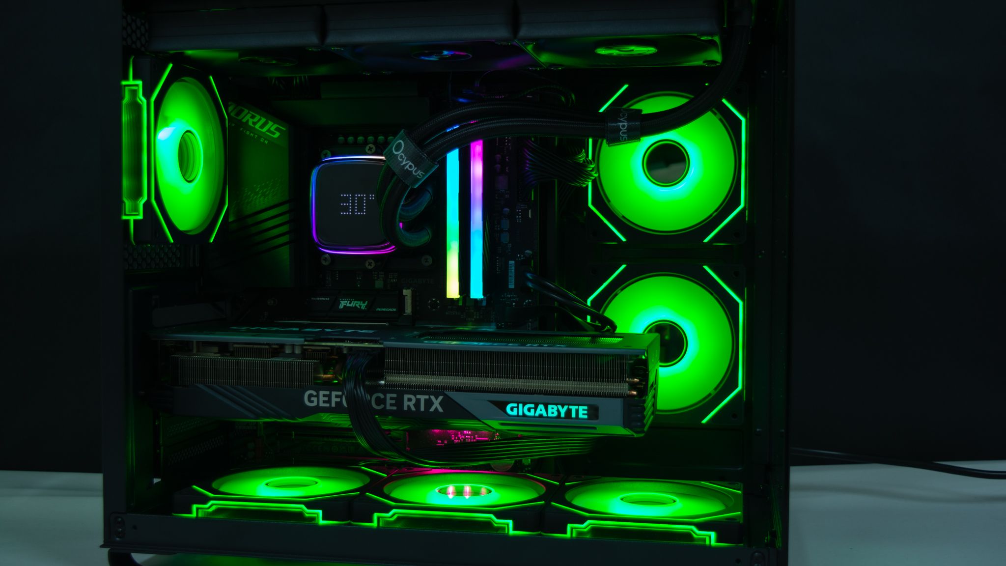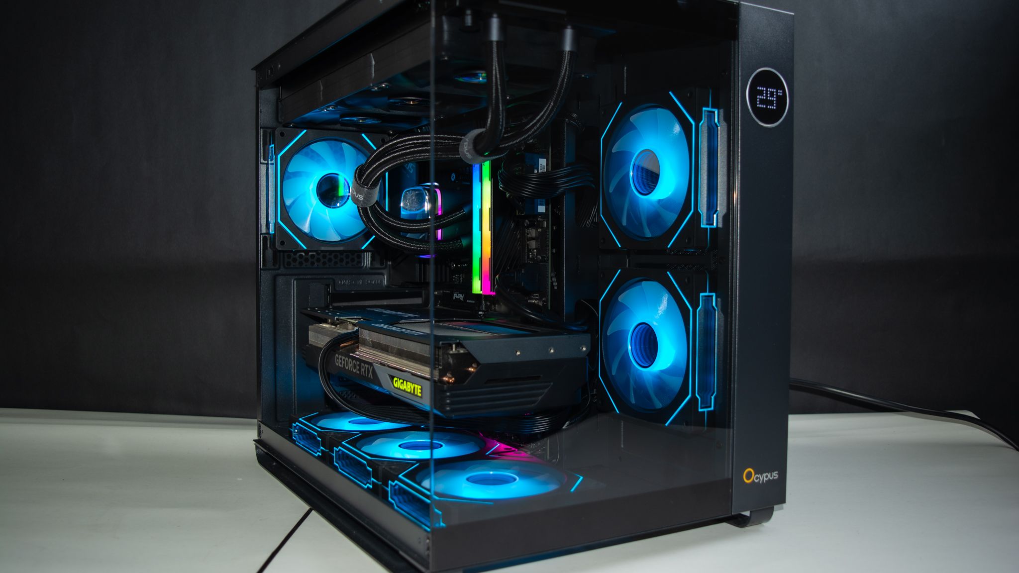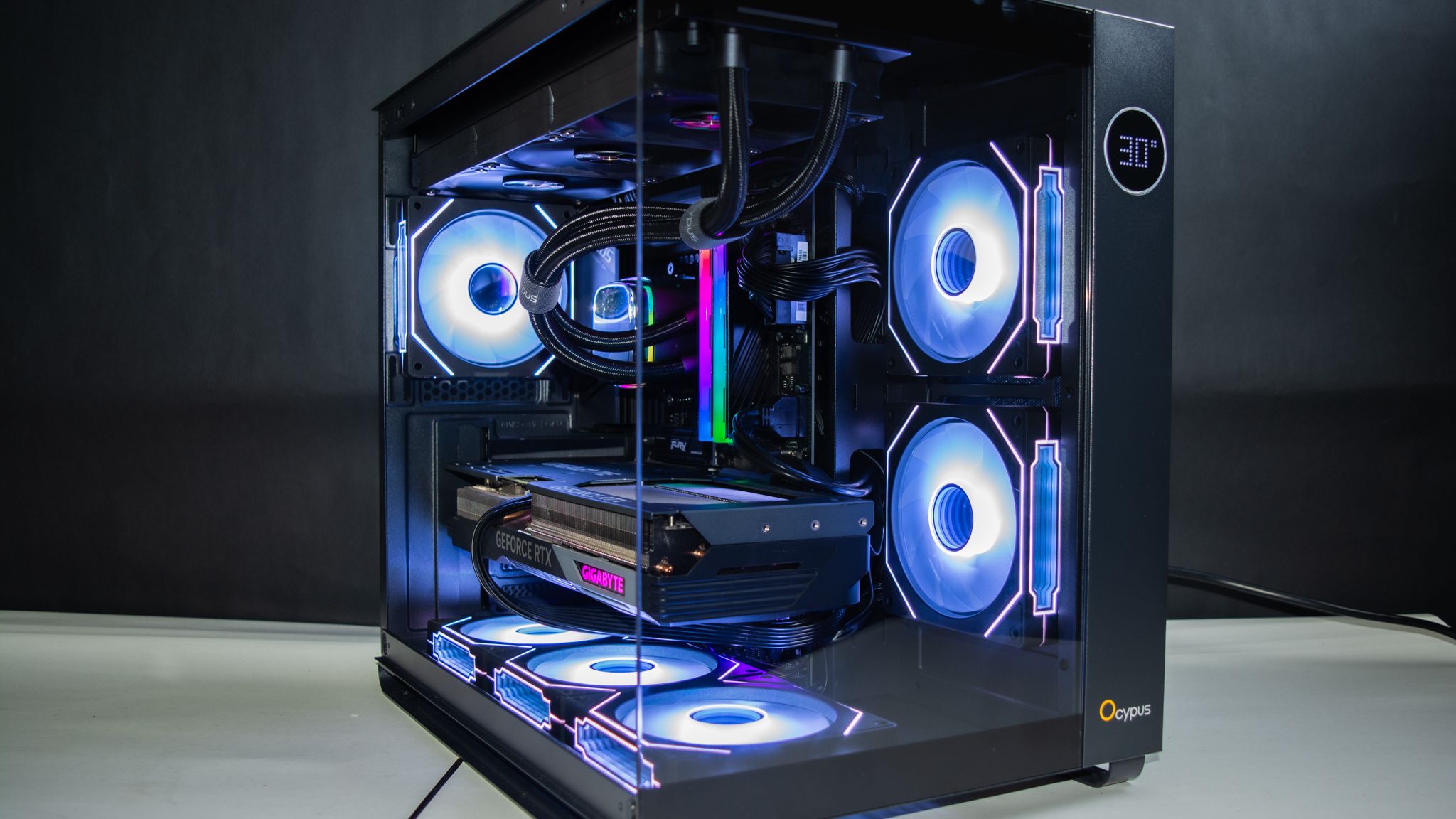 وتميز الجانب الأمامي أنه يحتوي على شاشة صغيرة على هيئة دائرة تعرض عليها درجة حرارة المعالج أو كارت الشاشة ويتم التحكم في ذلك عن طريق برنامج Ocypus Digital.
