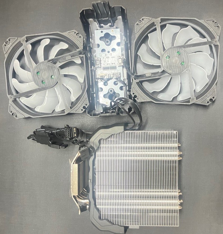2. ترتبط ست الأنابيب الحرارية بقاعدة المبرد التي تشبة في شكلها المرايا مع مسمارين يكون دورهم تماسك باقي قطع المبرد، مع تواجد 3 كابلات: