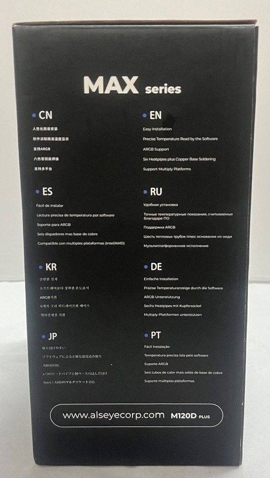 3. الأيمن: يحتوي في أعلاه على سلسلة المبرد MAX Series مع شرح بسيط للمبرد من حيث انه سهل التركيب ودعمه إلى ARGB ودعمه للعديد من المقابس وذلك عبر عدة لغات، مع أسفل الجانب الموقع الرسمي للشركة.