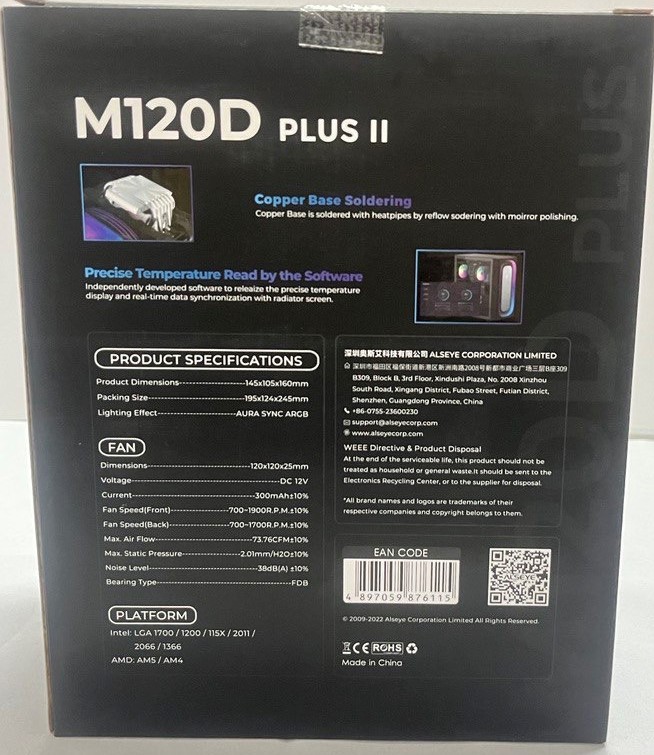 5. الخلفي: في أعلى الجانب كلمة M120D PLUS II مع شكل مقطعي لقاعدة المبرد مع بعض الشرح للمبرد من حيث الحجم الخاص به والمراوح الملحقة والدعم للمقابس، وأيضا يحتوي على تفاصيل عامة عن الشركة من حيث العنوان والايميل وارقام التليفونات و QR-Code لتسهيل عملية الوصول الموقع.