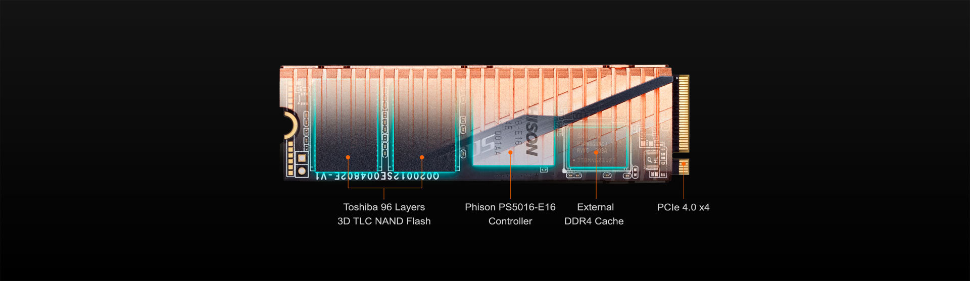 - المتحكم من شركة Phison من نوع PS5016-E16 والتي تعتبر أول شريحة تحكم PCI-e 4.0×4 فى العالم، تم تصنيعها بدقة تصنيع 28nm.
