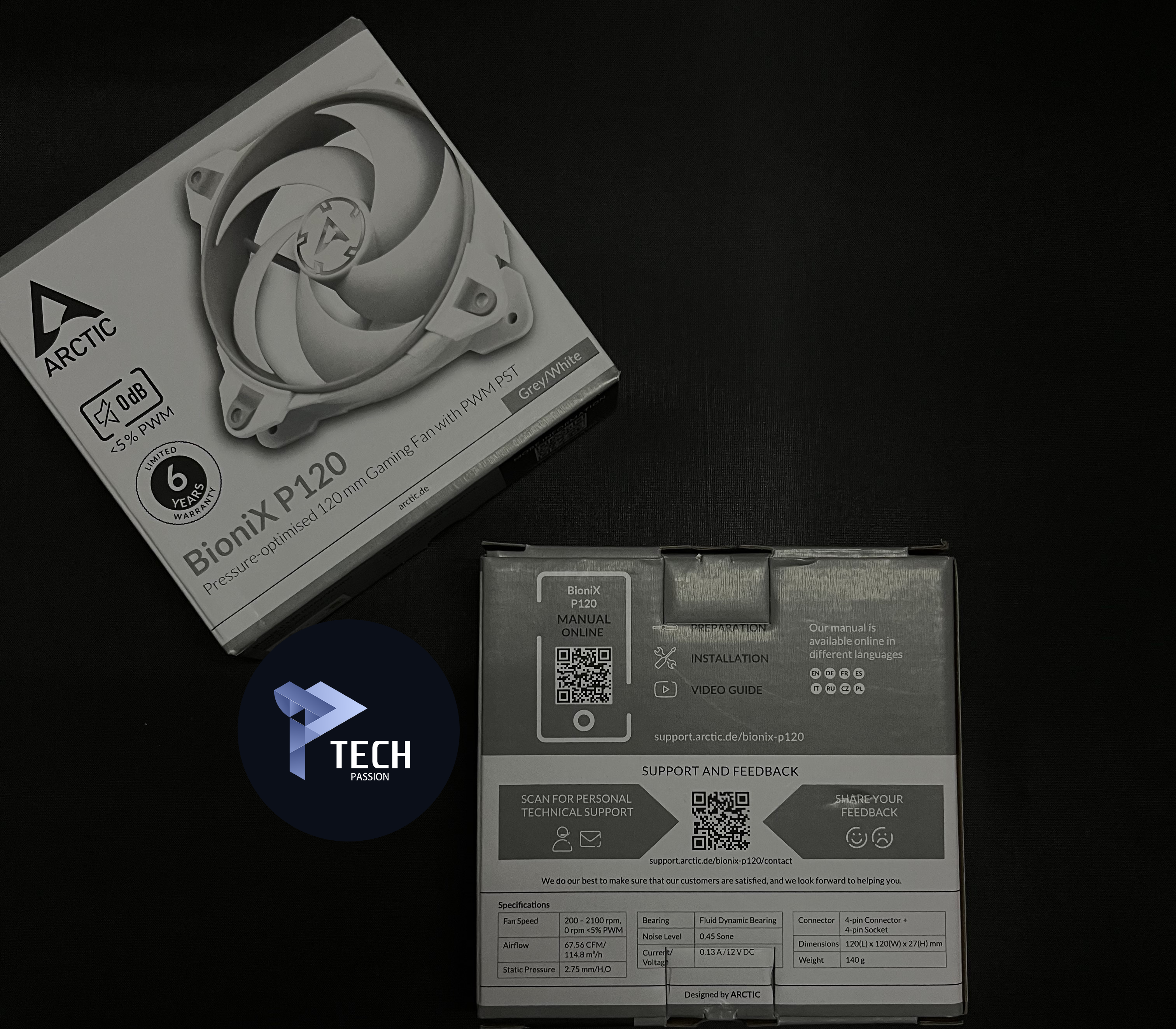 – الخلفي: يوضح ان المبرد مكون من برج واحد وملحق معه مروحة من نوع BioniX P-Series، بينما في باقي الجانب QR-Code خاص من أجل الحصول على تفاصيل أخرى.