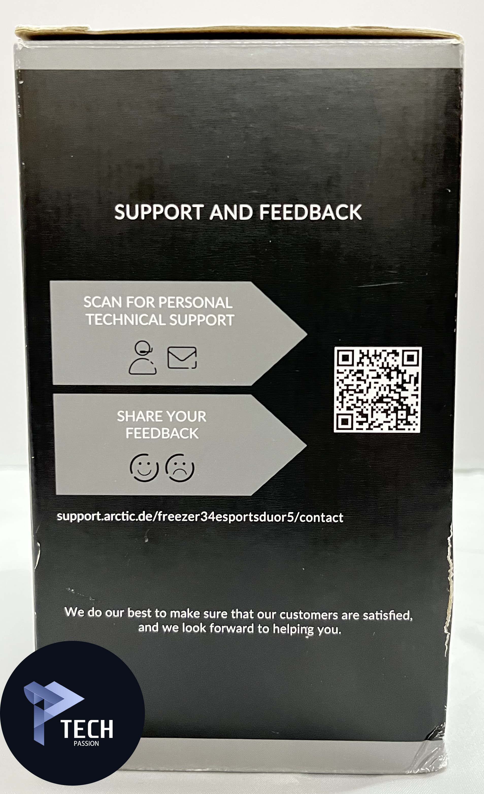 – الأمامي: يوضح اسم الشركة المصنعة ARCTIC مع اللوجو الخاص بهم مع اسم المبرد مع وصف بسيط للمبرد من حيث كونه برج واحد، مع اللون الذي يأتي به المبرد، بينما في أسفل الصندوق دعمة للعديد من المقابس.