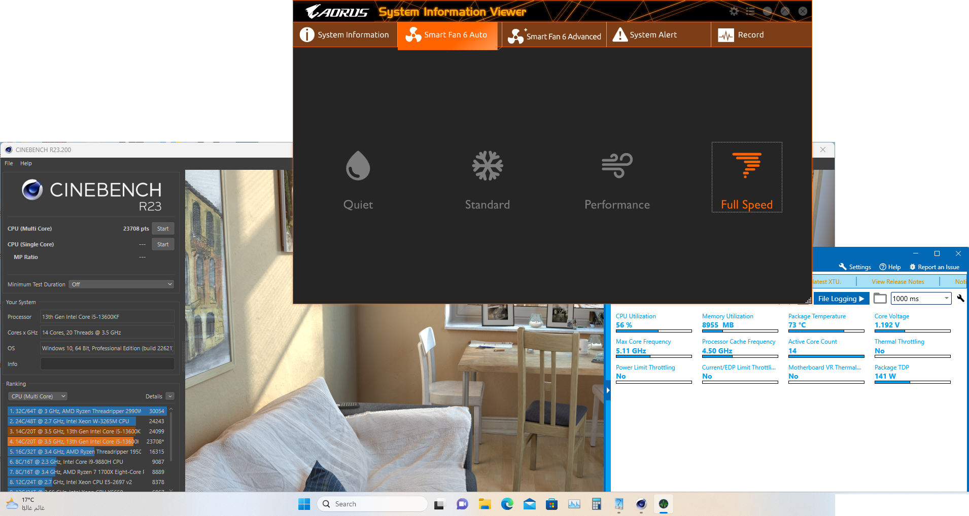 كانت نتيجة برنامج CINEBENCH R23 من حيث درجة الحرارة 73 درجة مع أداء البرنامج على الوضع الهادئ كان 23708، بينما باستخدام برنامج Clear Wave كانت الضوضاء 49dB، مع استخدام قدرة سحب طاقة أعلى و فولتية أعلى.