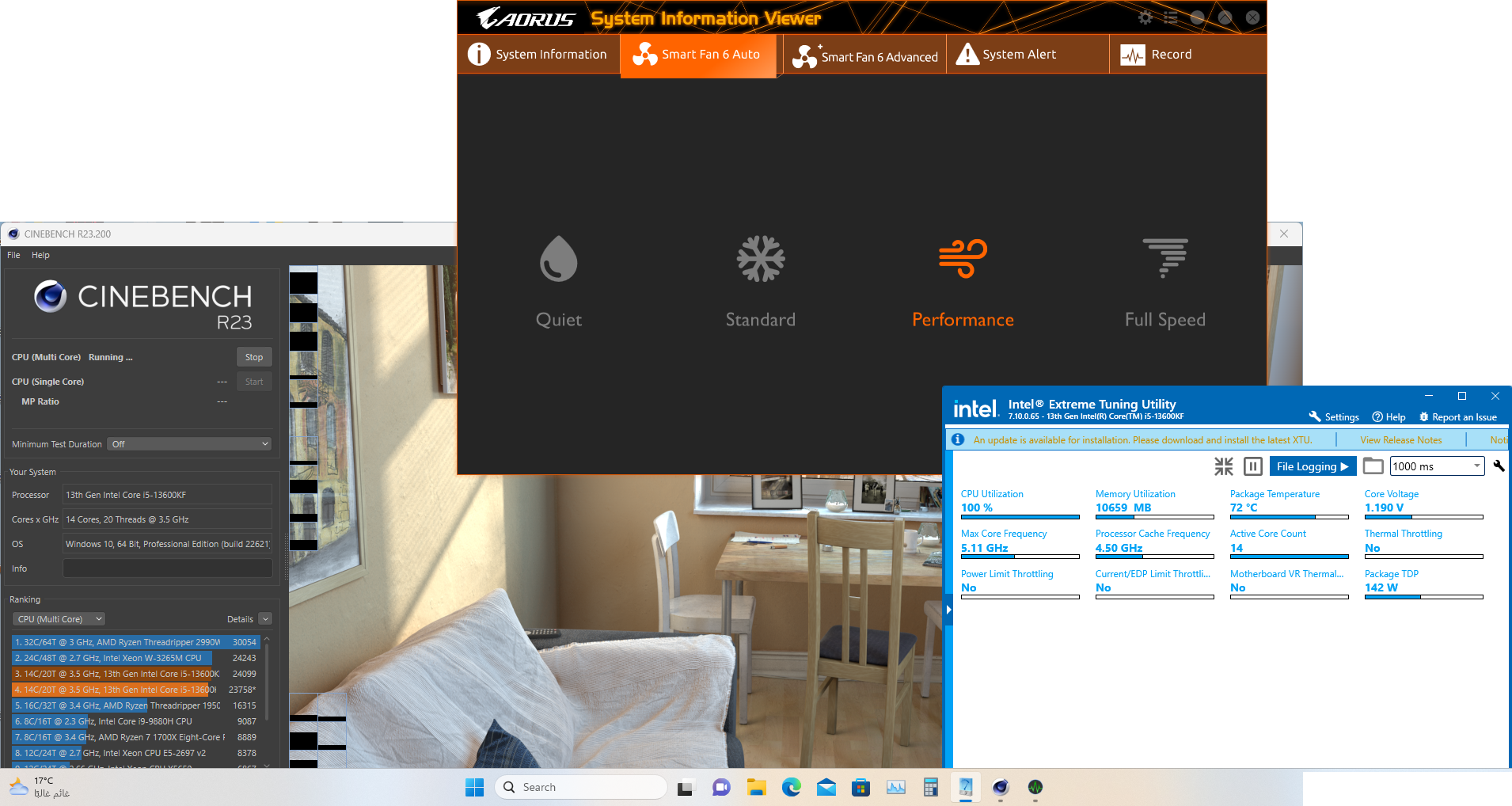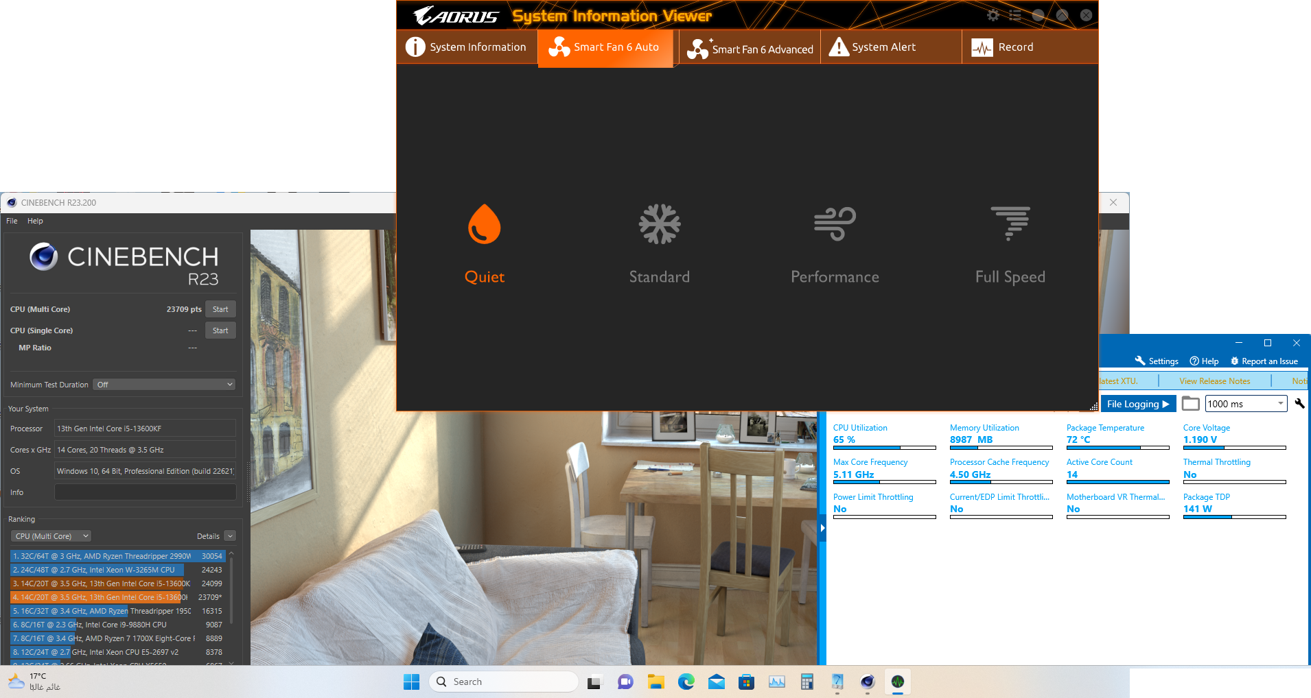 كانت نتيجة برنامج CINEBENCH R23 من حيث درجة الحرارة 72 درجة مع أداء البرنامج على الوضع الهادئ كان 23711، بينما باستخدام برنامج Clear Wave كانت الضوضاء 38dB، مع استخدام قدرة سحب طاقة أعلى و فولتية أعلى.