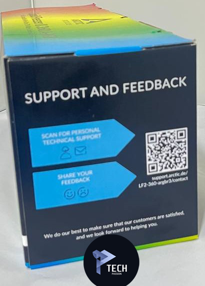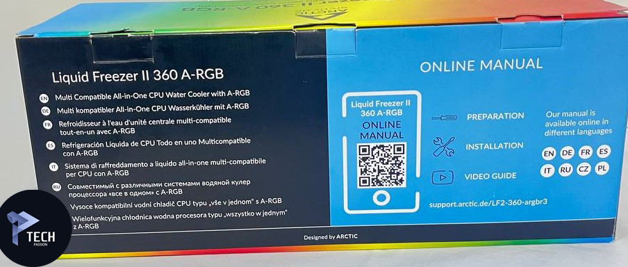 العلوي: يحتوي على لوجو شركة ARCTIC مع اسم الموقع مع اسم المبرد ARCTIC Liquid Freezer II 360 A-RGB، مع تأكيد دعم المبرد إلى الألوان المتوافقة.