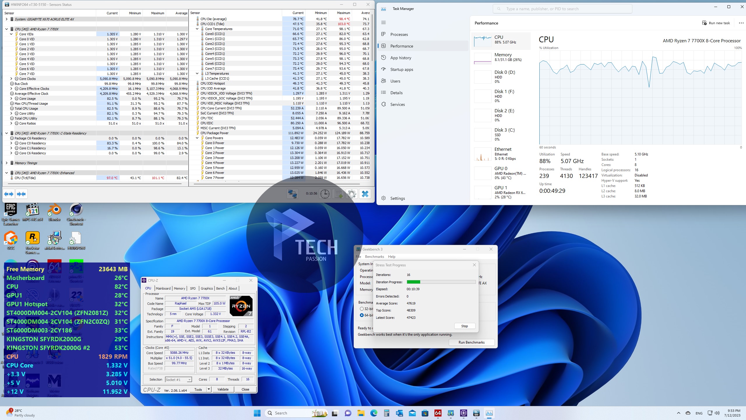 بداية الضغط على تردد 5.1GHz مع استخدام فولتية 1.320v تراوحت درجة الحرارة من 82 درجة إلى 100 مع متوسط درجات حرارة 90:95.