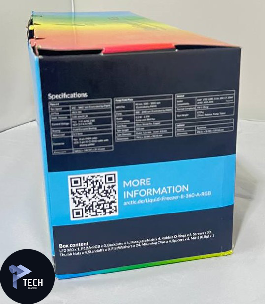 الأمامي: يوضح اسم الشركة المصنعة ARCTIC مع اللوجو الخاص بهم مع اسم المبرد، مع ذكر ما تميز به الجانب الأمامي من حيث: ضمان 6 سنوات، والجائزة الحاصل عليها المبرد وهي EUROPEAN HARDWARE AWARDS لعام 2022، والدعم لبرامج الخاصة بالشركات المصنعة للوحات الأم من أجل التحكم في ARGB، مع اللون الذي يأتي به المبرد، بينما في أسفل الصندوق دعمة للعديد من المقابس.