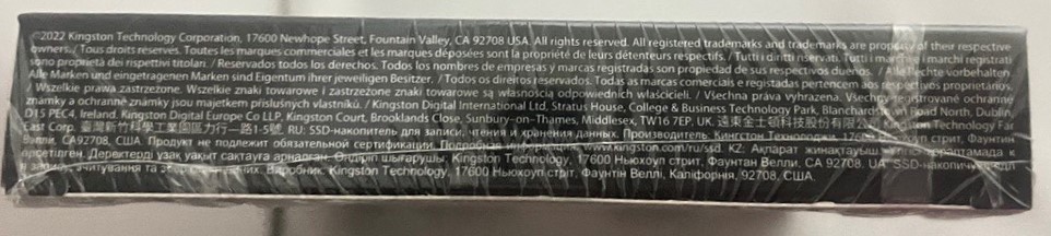 معلومات عن وحدة التخزين بعدة لغات مع الرقم التسلسي. - السفلي يحتوي على حقوق النشر والطبع الخاصين بالشركة ومكانها المتواجد في انجلترا بعدة لغات.