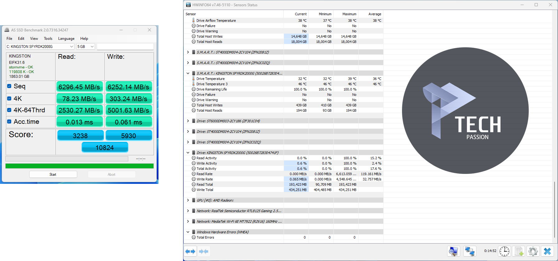 الأولى: تبين سرعة القراءة والكتابة في أربع حالات من حيث التتابع ومن خلال 4K وأيضا قراءات اخرى، ووصلت سرعة القراءة إلى 6.2GB/s بينما الكتابة إلى 6.2GB/s، وهذه السرعات قريبة من المعلنة.