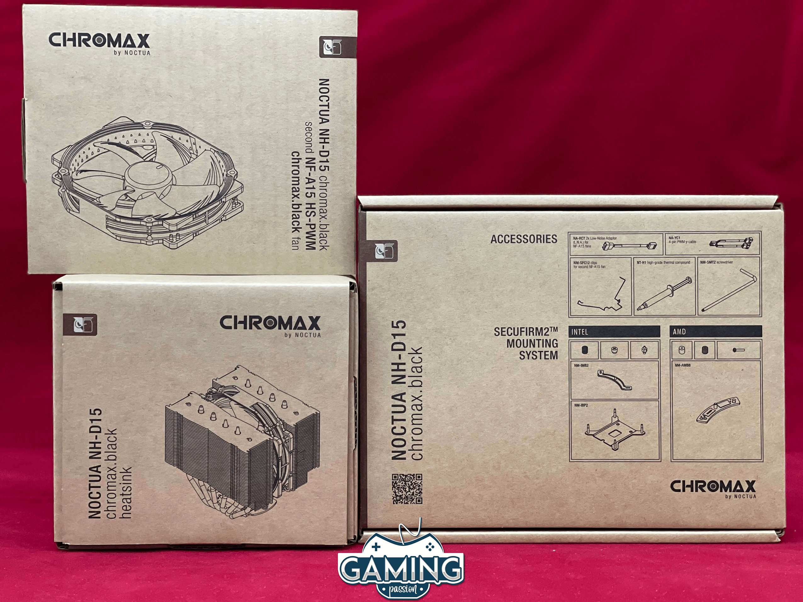 • يأتي مبرد Noctua NH D15 Chromax بصندوق أساسي بداخله ثلاث صناديق أخرى بتغليف جيد وتوضيح بمحتويات الصناديق، حيث الصندوق الكبير للمشتت والصندوق الثاني للمروحة الأخرى والصندوق الأخير به الإكسسوارات اللازمة للتركيب من معجون حراري والمسامير اللازمة للتركيب كلا معالجي INTEL أو AMD.