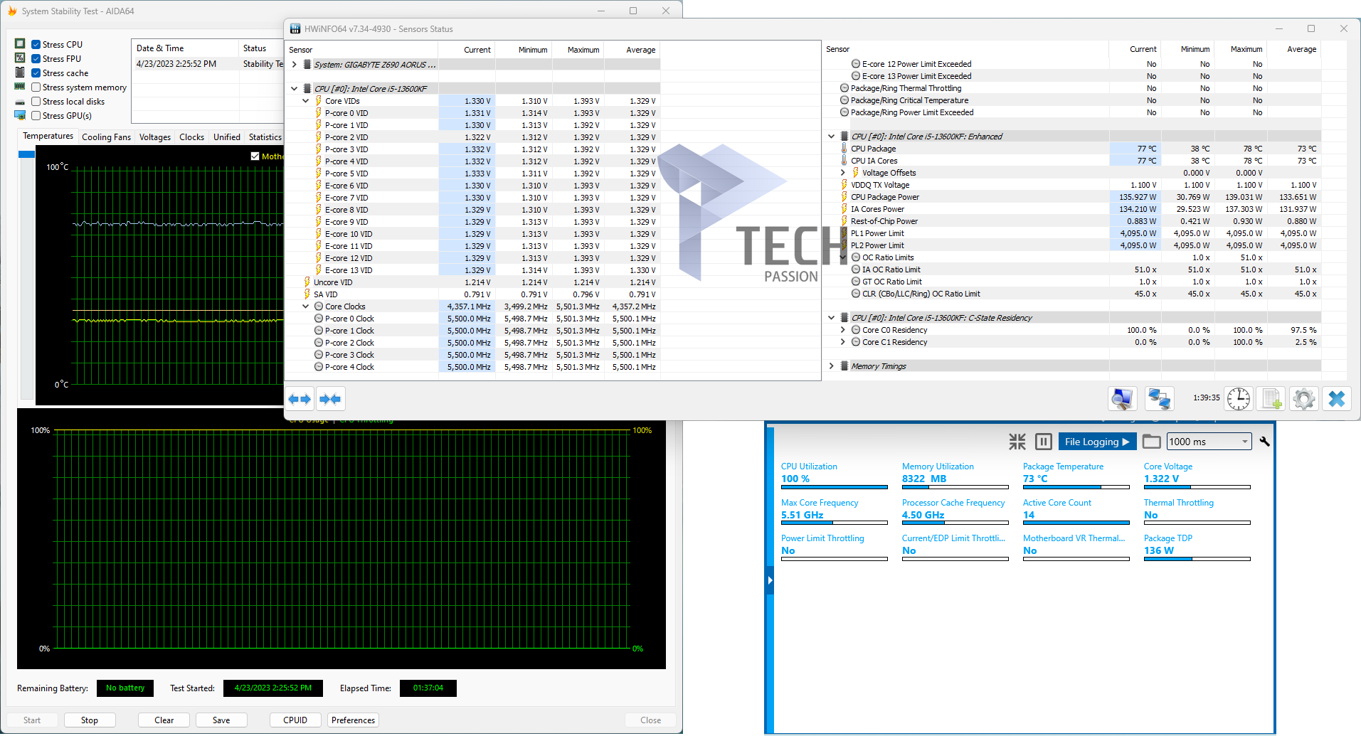 كانت نتيجة برنامج CINEBENCH R23 من حيث درجة الحرارة 77 درجة مع أداء البرنامج على الوضع الهادئ كان 23373، بينما باستخدام برنامج Clear Wave كانت الضوضاء 38dB، مع استخدام قدرة سحب طاقة أعلى و فولتية أعلى.