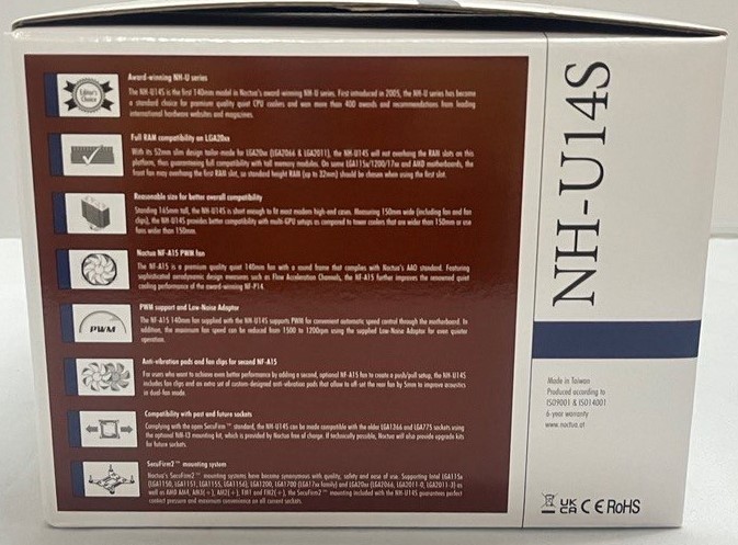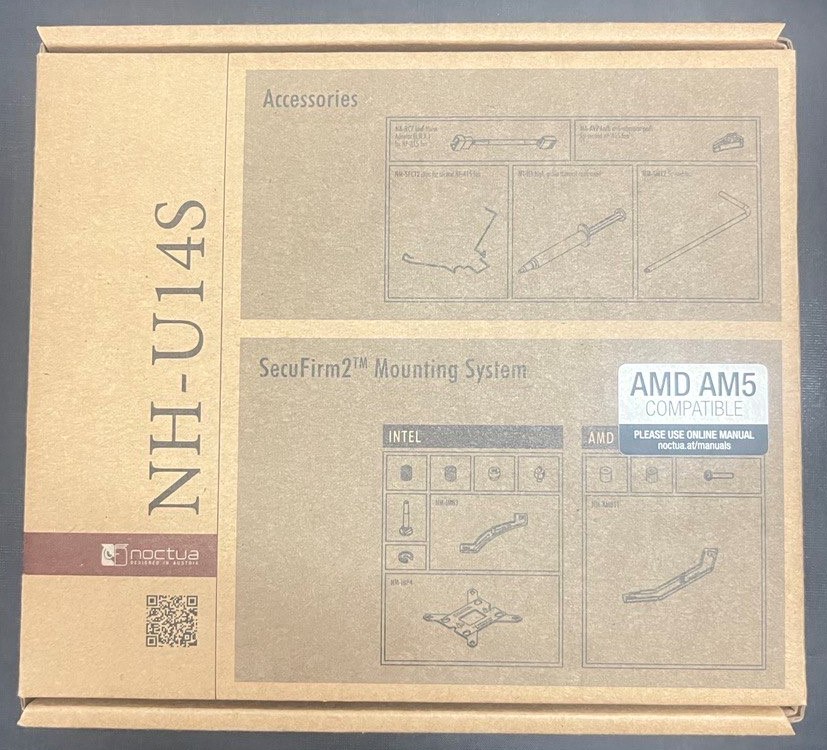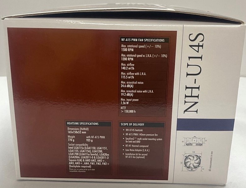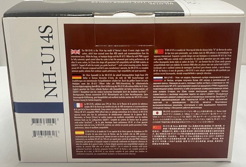 - العلوي والأمامي: يحتوي كلا الجانبين على اسم المبرد NH-U14s مع ذكر حجم المروحة 140 ملم مع وصف لطبيعة البرج الخاص بالمبرد والذي يشبه حرف U،