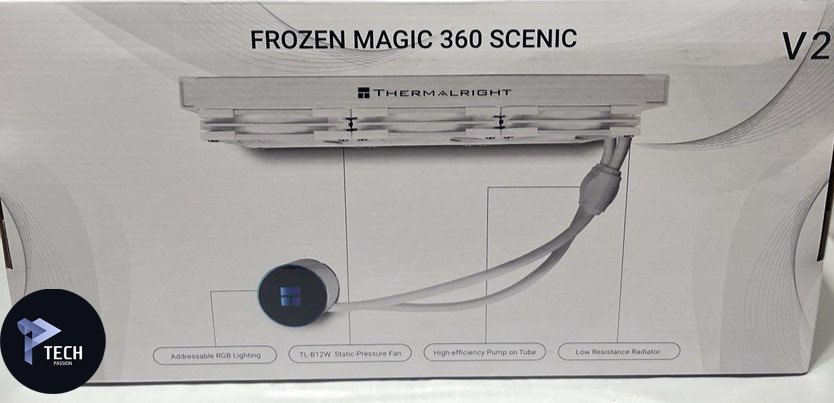 الأمامي يحتوي على اسم الشركة Thermal Right مع اللوجو الخاص بالشركة مع اسم المبرد Frozen Magic 360 Scenic، وفي أقصى الجانب الأيمن اصدار المبرد V2.