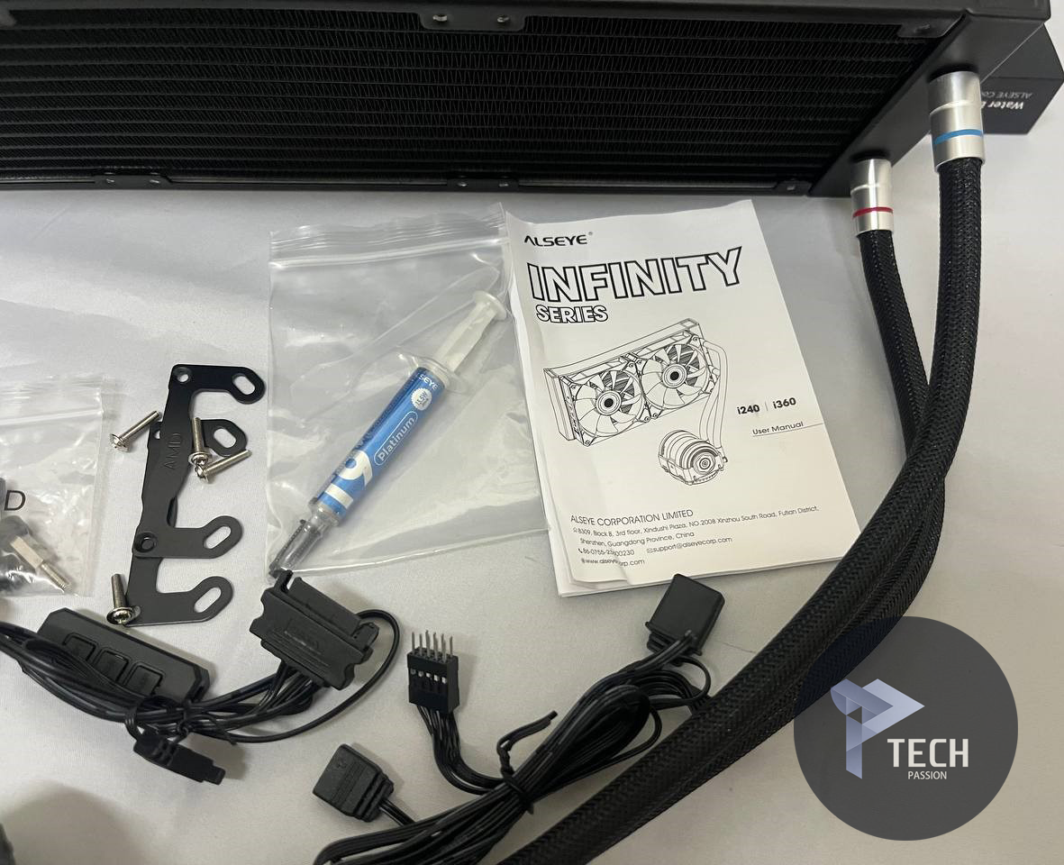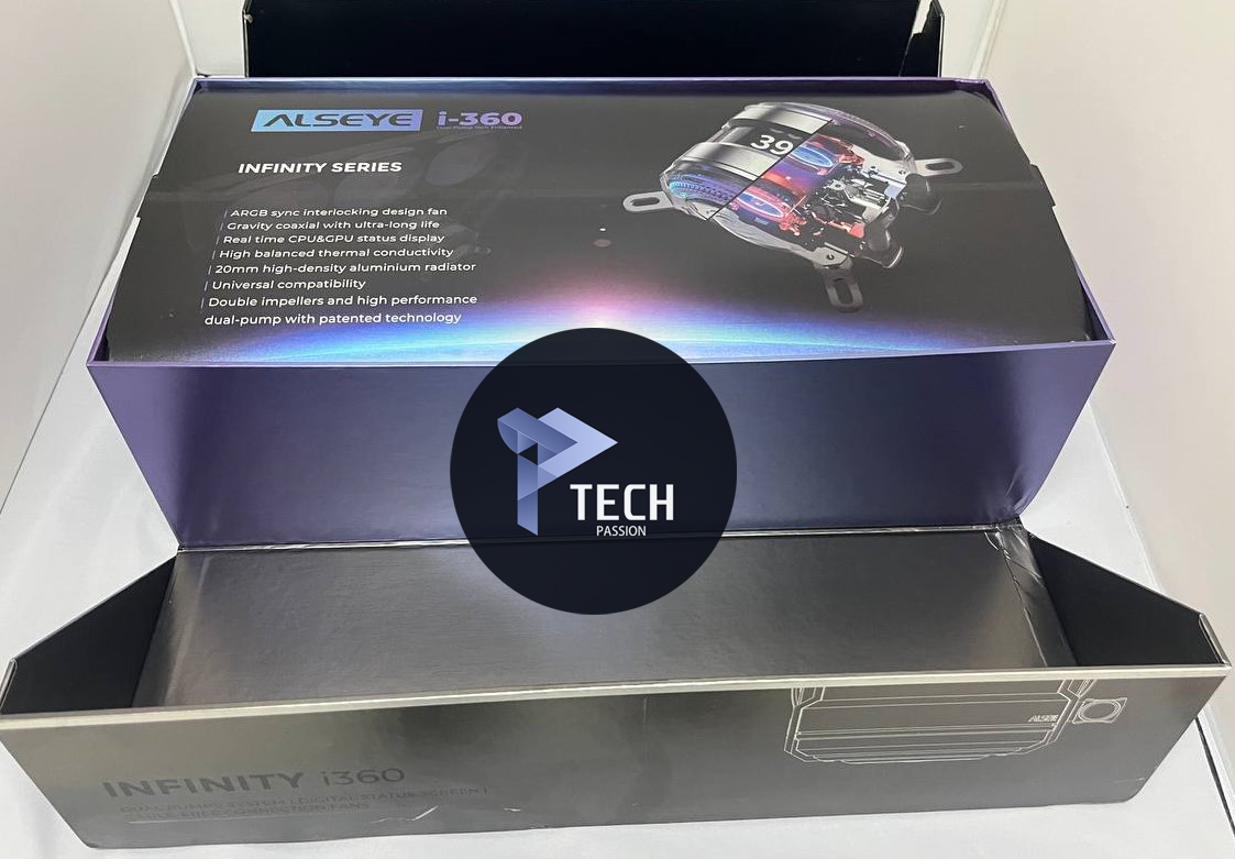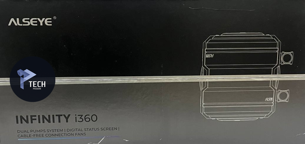 العلوي: على اسم المبرد INFINITY i 360 مع شكل المضخة بشكل ثلاثي الأبعاد، يعلوه ايضا اسم الشركة ALSEYE مع وصف للمبرد من تكوينه من مضختين مع شاشة رقمية توضح البيانات كما سنرى أثناء التجربة.
