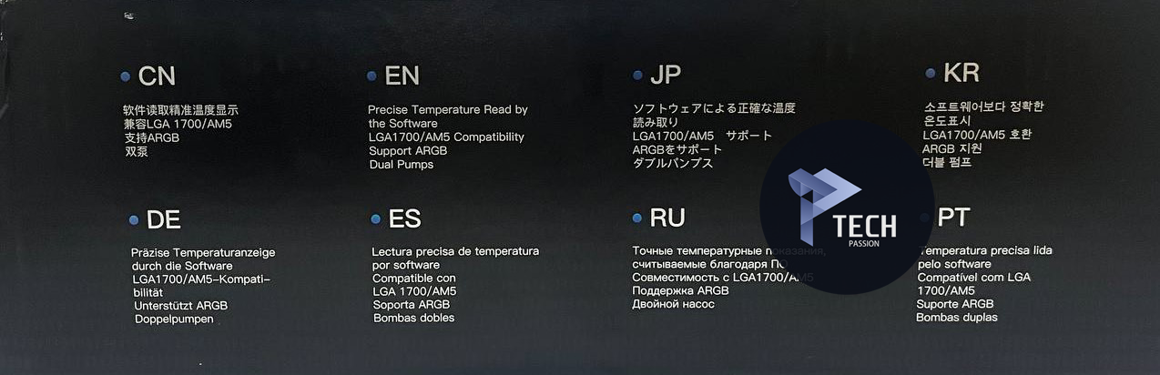 الأمامي: يحتوي على وصف للمبرد من حيث كونه مبرد سائل دقيق (precise temperature liquid cooler)، بينما الجانب الأمامي الأخر يحتوي على دعم المبرد للعديد من المقابس بعدة لغات.