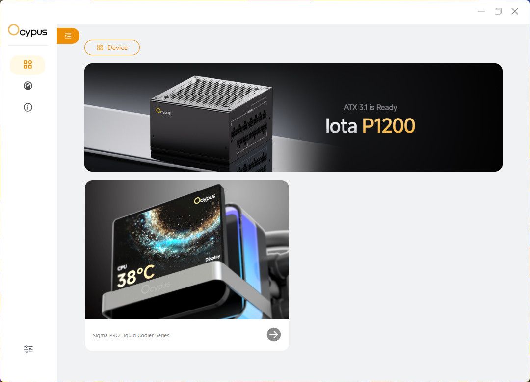تأتي واجهة البرنامج  أربع ICONS حيث تأتي الأولى تشير إلى الأجهزة لكن في البداية يعرض المنتج الجديد الخاص بـ الشركة أو التي تستعد الشركة في إطلاقه، وأسفلة المنتج المثبت مثل مبرد اليوم Sigma L36 PRO، بينما في الثانية يعرض المواصفات العامة للجهاز وقدرة الاستهلاك الحالية للقطع، والثالثة تعرض جميع التفاصيل الخاصة بـ الجهاز بـ الرقم التسلسلي الخاص بـ القطعة، والرابعة تمكنك في التحكم في لغة البرنامج وطبيعة درجات الحرارة سواء سيليزية أو فهرنهايت.
