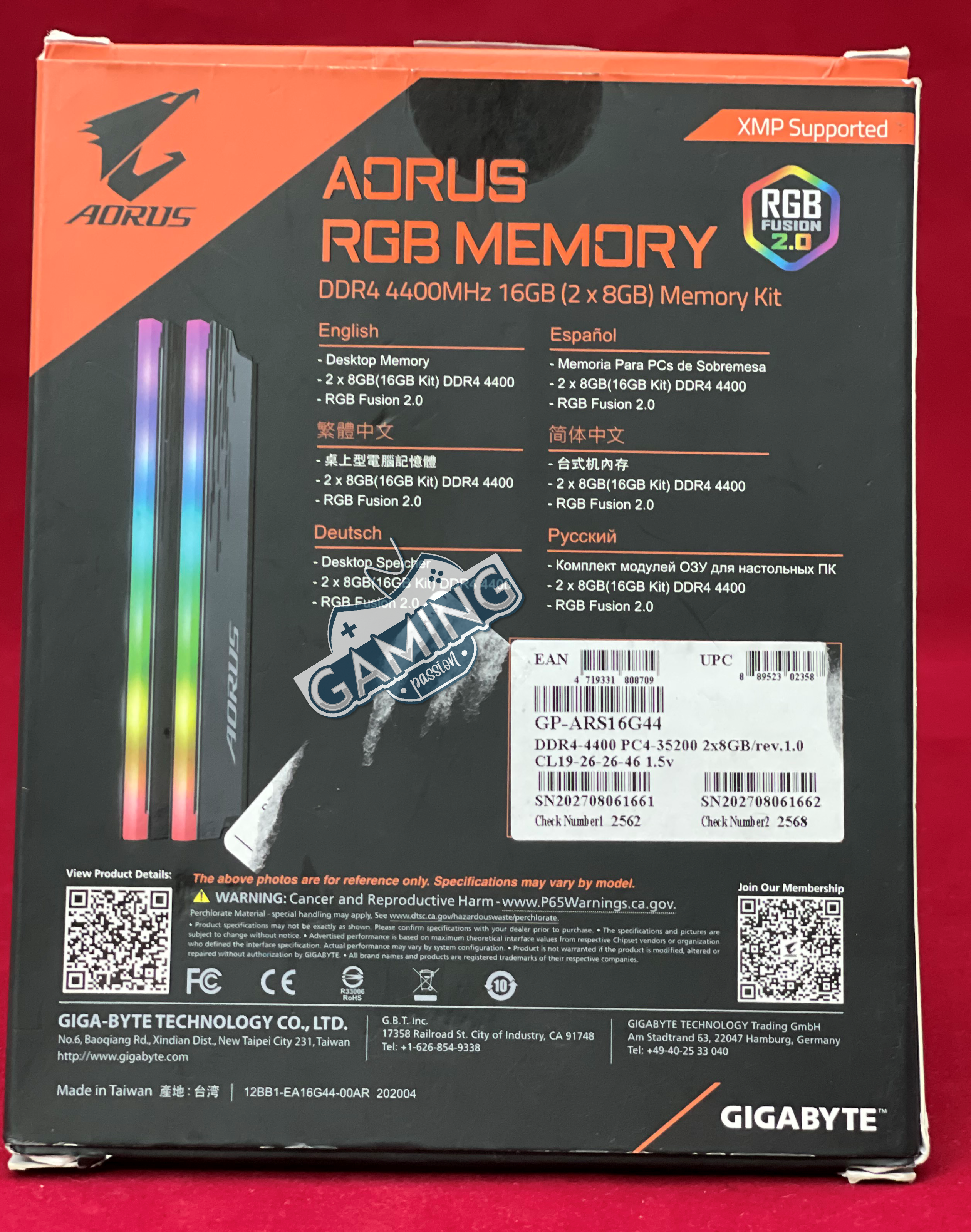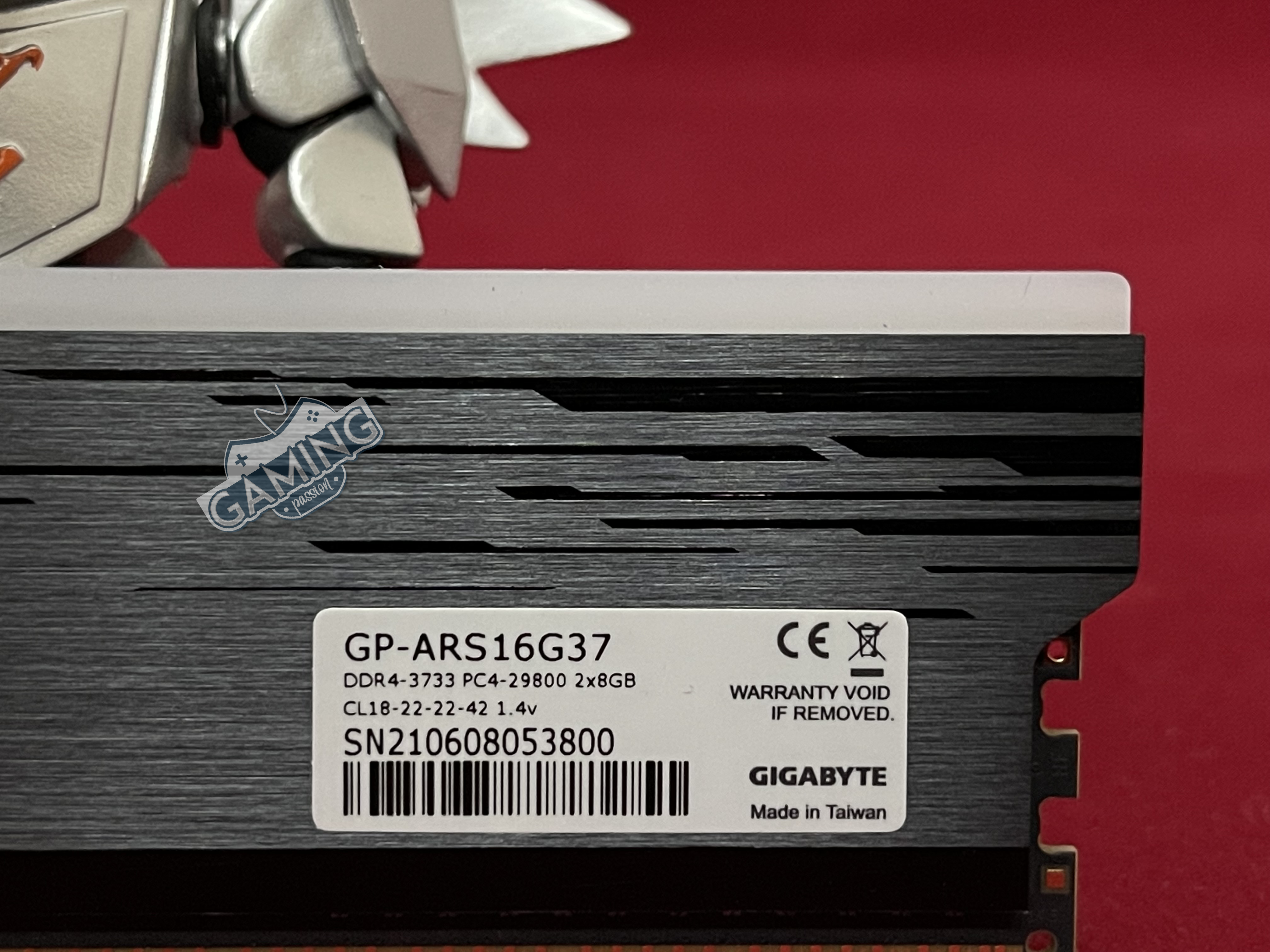 – تأتي Aorus RGB Memory باللون الرصاصي المميز مع علامة أورس المميزة لها على إحدى الجوانب الخاصة بها والجانب الأخر يحتوي على Aorus مع دليل الرامات من حيث CL- Speed – Serial Number – Gigabyte- Taiwan.